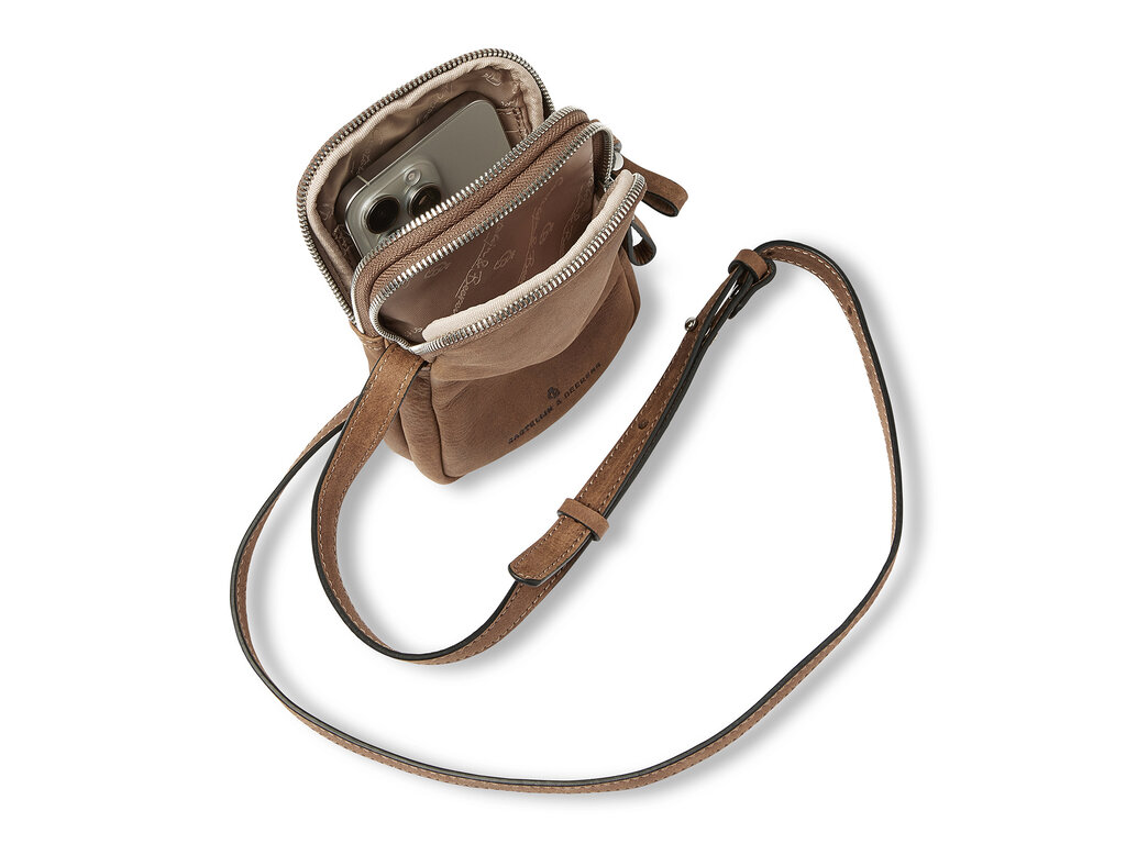 Elegant, funktional und nachhaltig. Diese Crossbody-Handytasche hat alles. In den 2 separaten Reißverschlussfächern gibt es Platz für ein Smartphone und z.B. ein kleines Portemonnaie oder eine Brille. Die Tasche verfügt außerdem über 3 Kreditkartenfächer und einen verstellbaren Lederschulterriemen. Für diese Kollektion haben wir in Zusammenarbeit mit unserer italienischen Partner-Gerberei hochwertiges, geschmeidiges Leder entwickelt. Nicht nur zeitlos, sondern auch eine nachhaltige Wahl. Das Leder ist nämlich pflanzlich gegerbt, gemäß den Richtlinien der Leather Working Group.