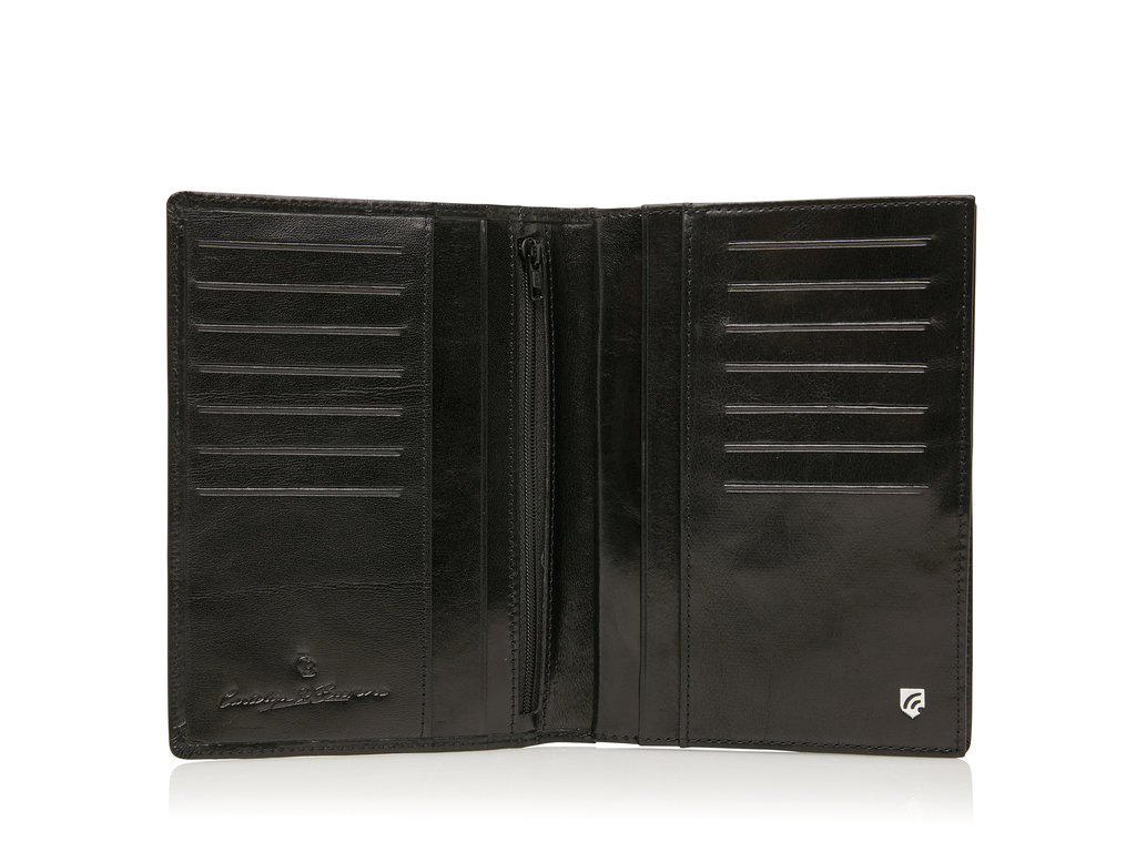 Extra geräumige RFID Lederbrieftasche mit viel Platz für Fahrzeugpapiere, Führerschein und Geldscheine. Das Leder-Portemonnaie hat 15 Kreditkartenfächer und ein Reißverschlussfach. Die Gaucho-Kollektion ist mit einer High-Tech-Folie ausgerüstet, die das Auslesen Ihrer persönlichen Daten über den RFID-Chip auf Ihren Karten verhindert. Diese exklusive Lederbrieftasche aus der Gaucho-Kollektion wird aus Stierleder hergestellt, das mit einem transparenten Farbstoff behandelt wurde, und ist mit dem eleganten C&B-Logo in einem Oval aus Leder versehen. Das Leder-Portemonnaie für Fahrzeugpapiere ist erhältlich in den Farben Schwarz, Mokka und Cognac.