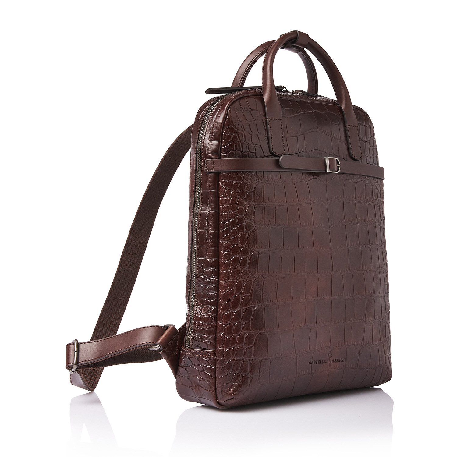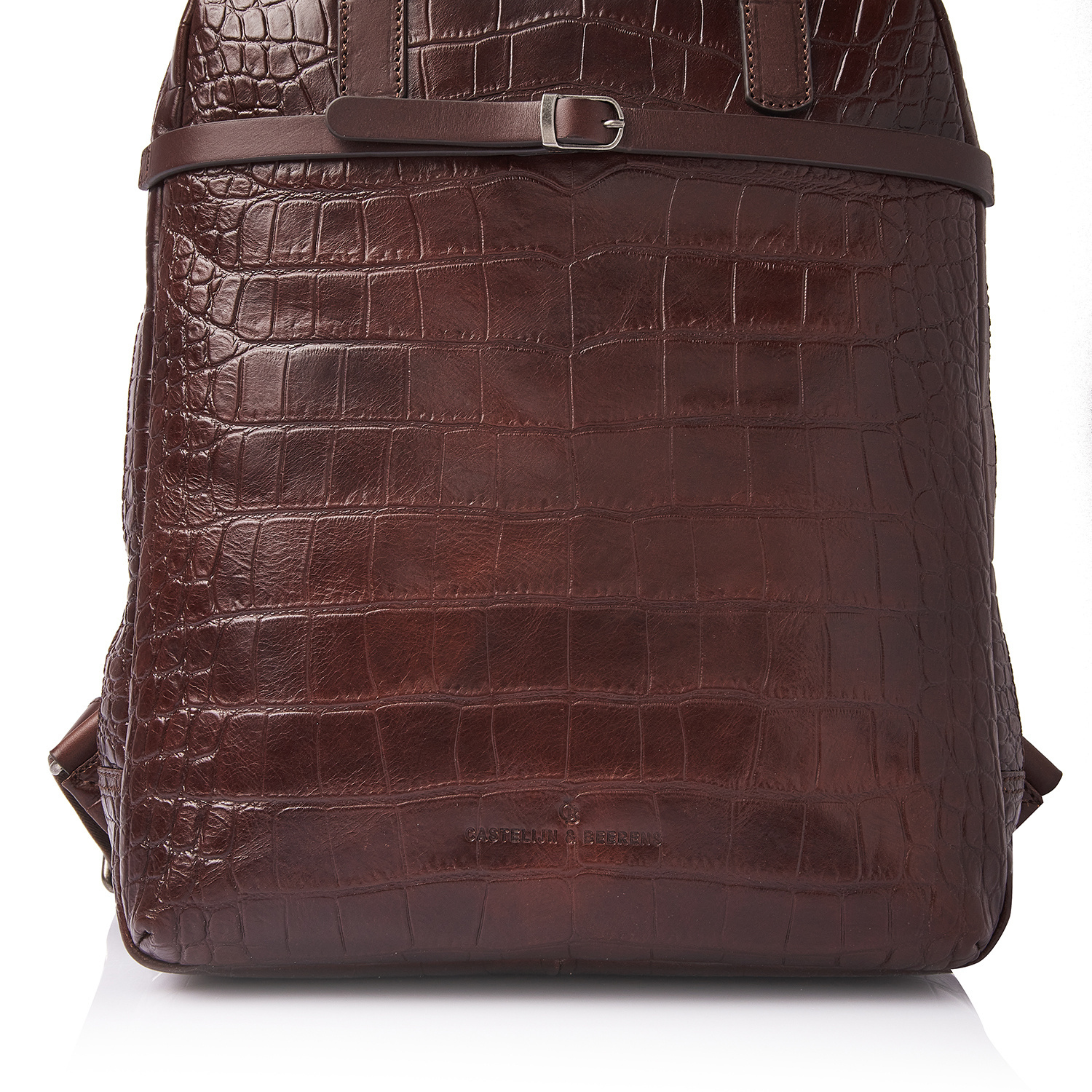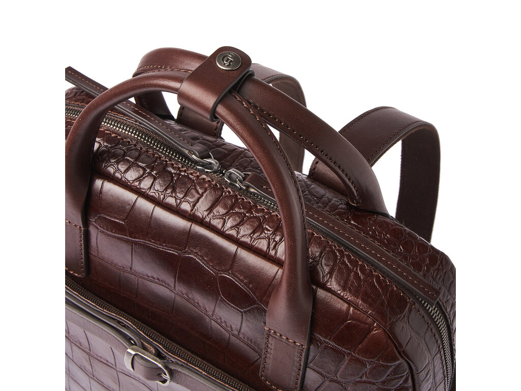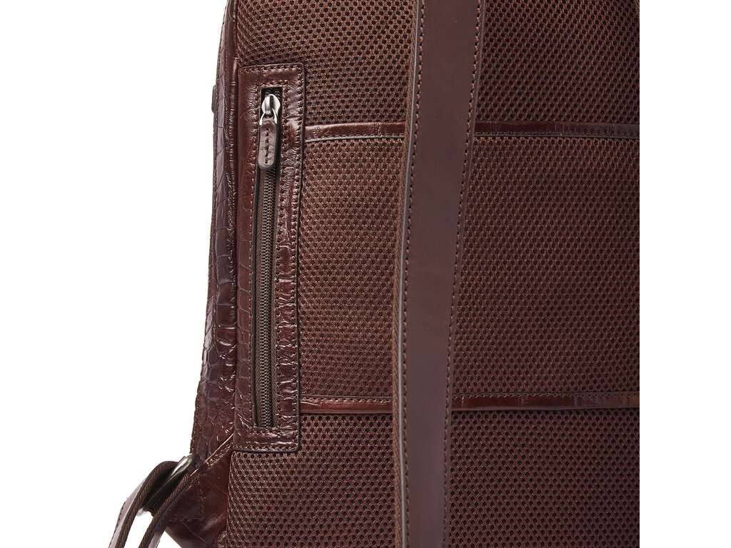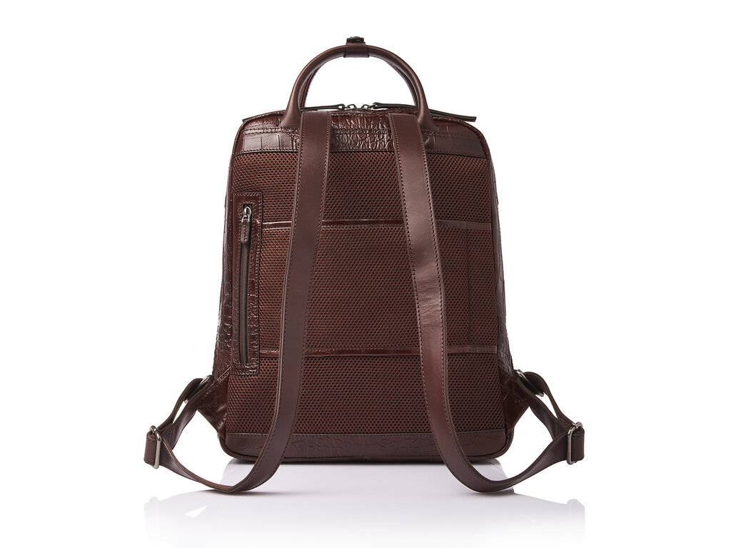 The Emma laptop backpack is a stylish eye-catcher. For this collection, we developed high-quality bull leather with a classic croco print in collaboration with our Tuscan partner tannery. Not only stylish, but also a sustainable choice. The leather is vegetable tanned according to the guidelines of the Leather Working Group. The handles and shoulder straps are made of sturdy belt leather. This leather backpack features a reinforced 15.6-inch laptop compartment and tablet compartment, several zip pockets and a practical organiser section for phone, pens and business cards. The special RFID zip pocket protects your bank cards, credit cards and passport against skimming. Extra carrying comfort is provided by the reinforced back panel and adjustable leather shoulder straps. The trolley sleeve is ideal when travelling with a trolley. The refined C&B embossing completes the luxurious look. A practical rain cover by Castelijn & Beerens is included.
