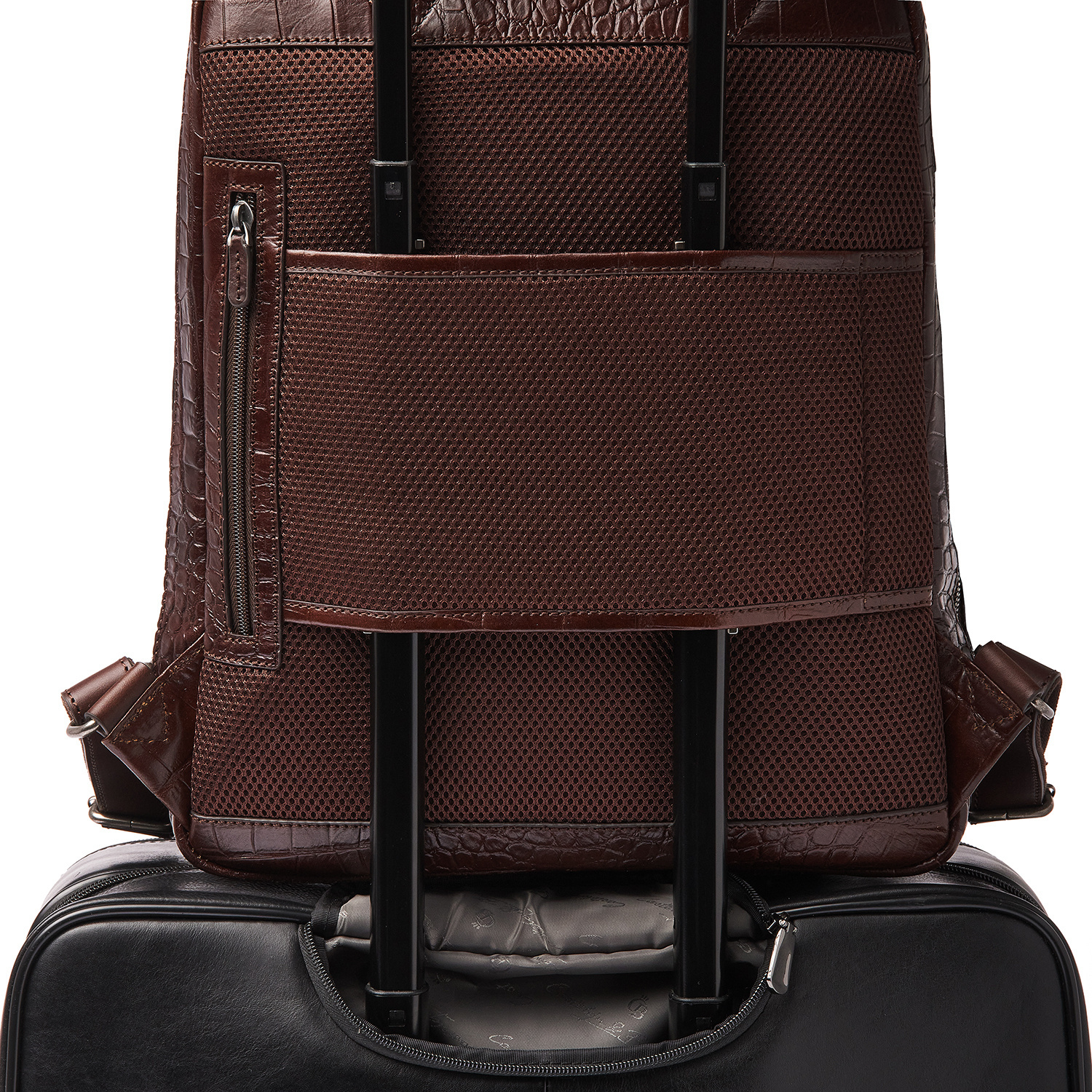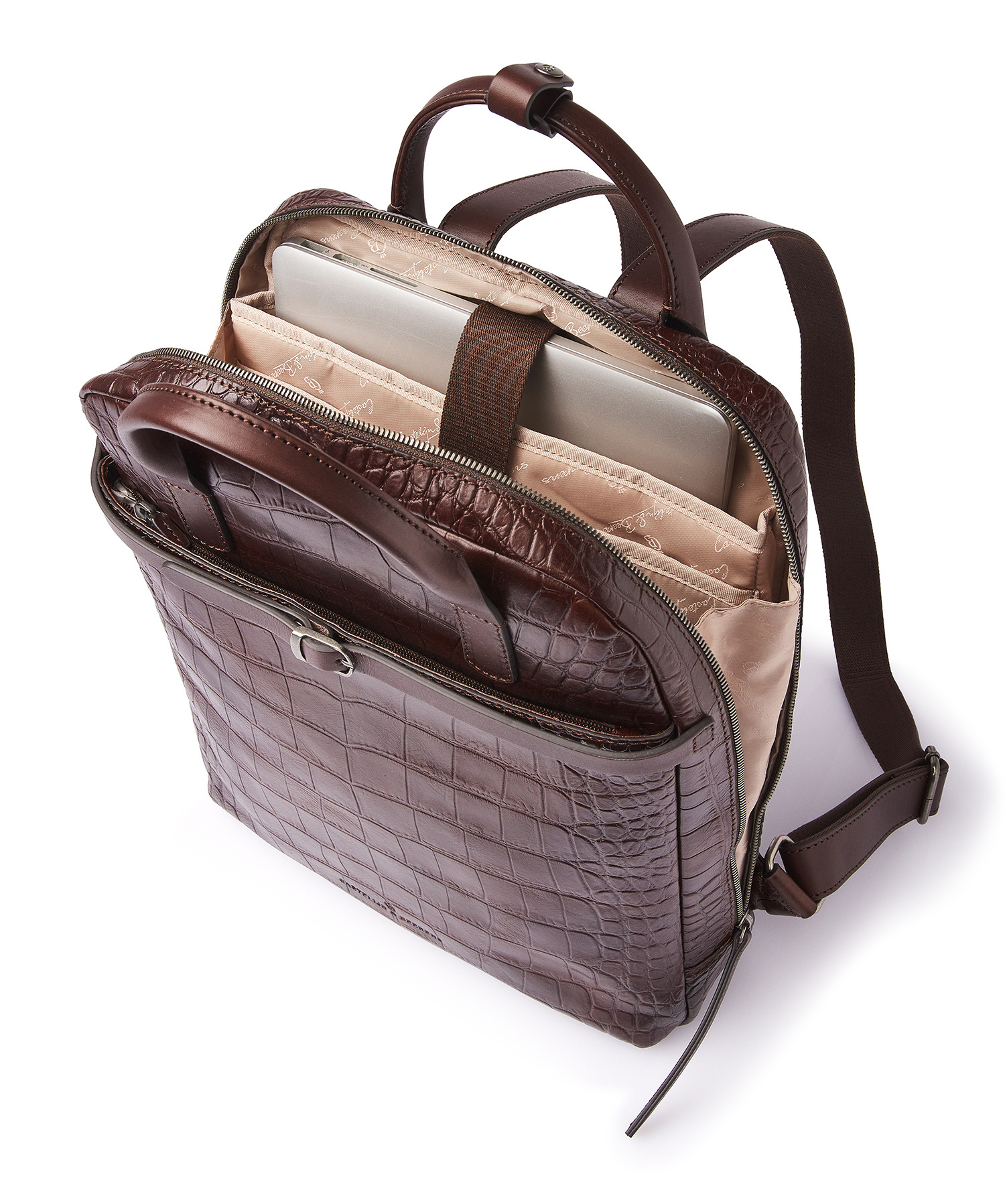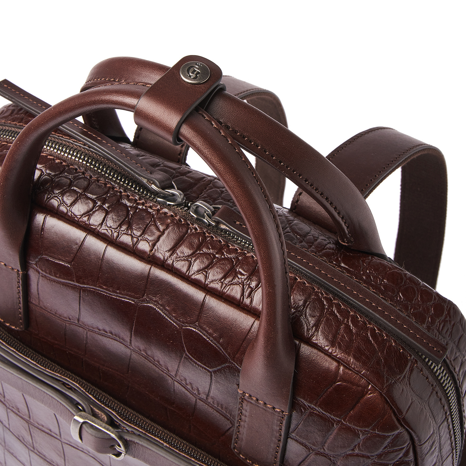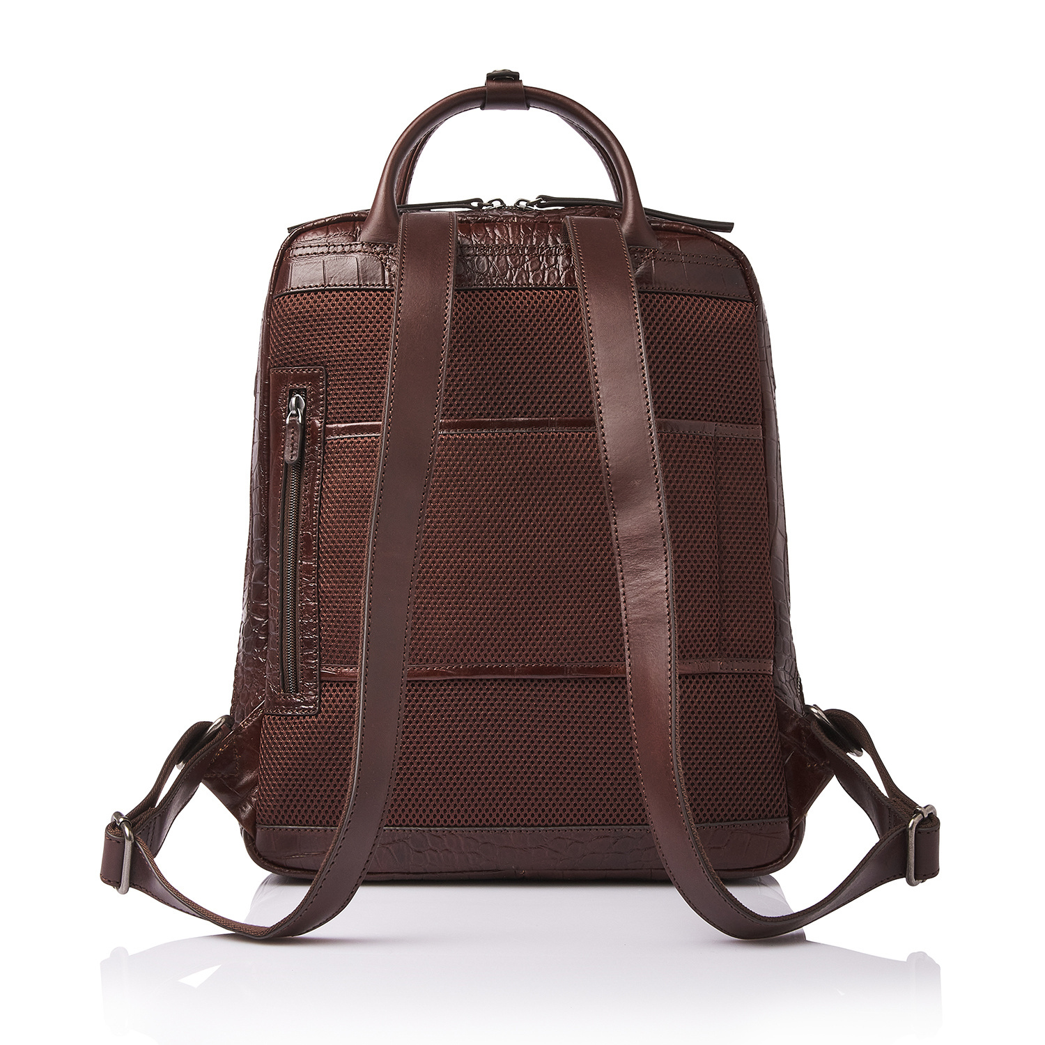 The Emma laptop backpack is a stylish eye-catcher. For this collection, we developed high-quality bull leather with a classic croco print in collaboration with our Tuscan partner tannery. Not only stylish, but also a sustainable choice. The leather is vegetable tanned according to the guidelines of the Leather Working Group. The handles and shoulder straps are made of sturdy belt leather. This leather backpack features a reinforced 15.6-inch laptop compartment and tablet compartment, several zip pockets and a practical organiser section for phone, pens and business cards. The special RFID zip pocket protects your bank cards, credit cards and passport against skimming. Extra carrying comfort is provided by the reinforced back panel and adjustable leather shoulder straps. The trolley sleeve is ideal when travelling with a trolley. The refined C&B embossing completes the luxurious look. A practical rain cover by Castelijn & Beerens is included.
