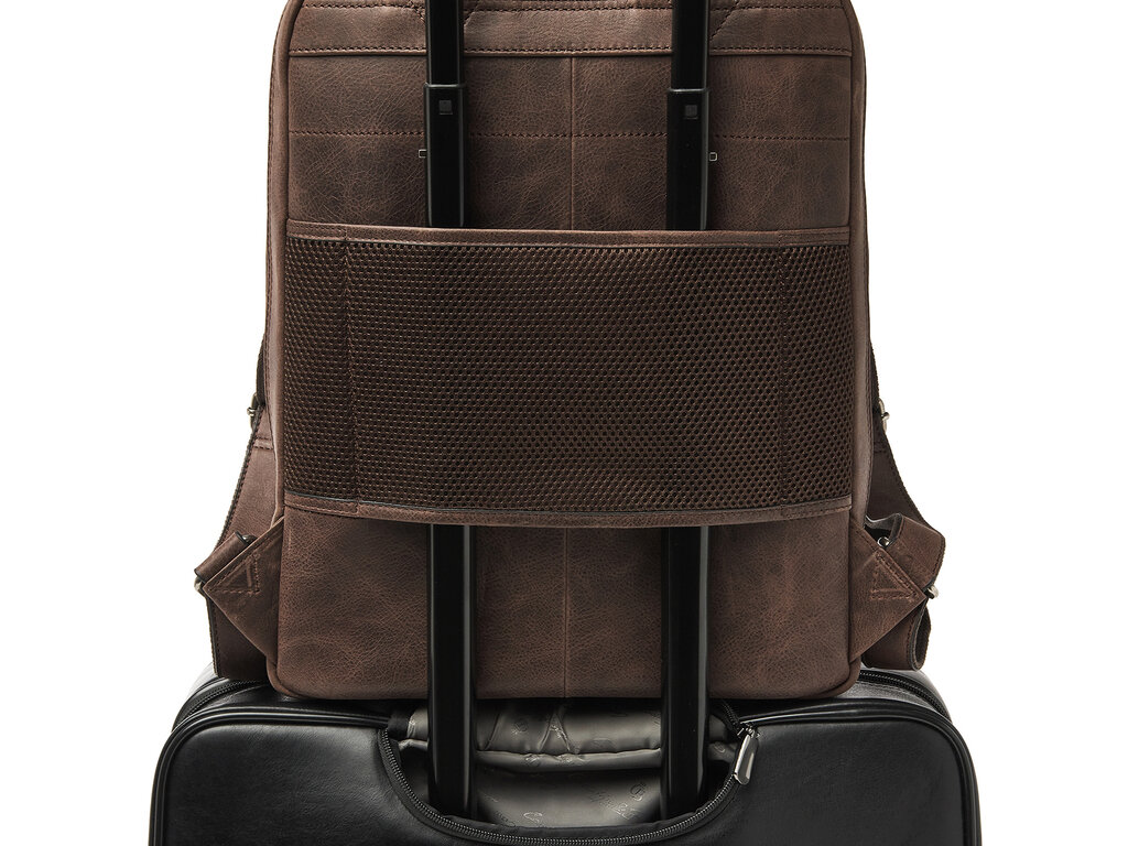 Stylish leather Laptop Backpack. Features reinforced compartments for laptop up to 15,6" and for tablet, several zip-pockets for files, practical organiser part for cell phone, pens, business cards etc. Extra comfortable to wear with foamed backside and firm and adjustable leather shoulder straps. From the Carisma range, made from supple Italian bovine leather with a natural grain. The Italian leather is tanned in a sustainable way according to the protocols of the Leather Working Group. The backpack comes with a handy rain cover by Castelijn & Beerens.