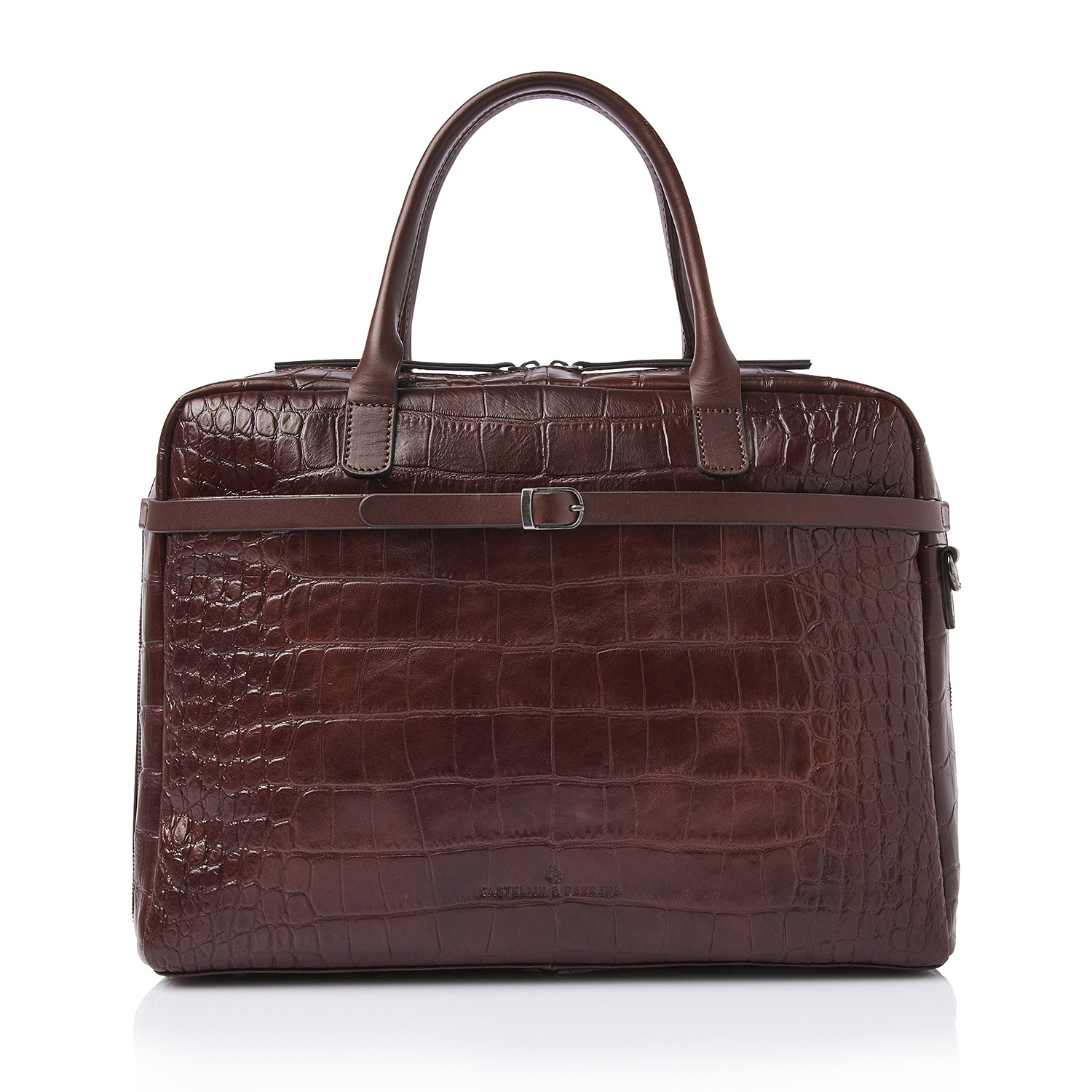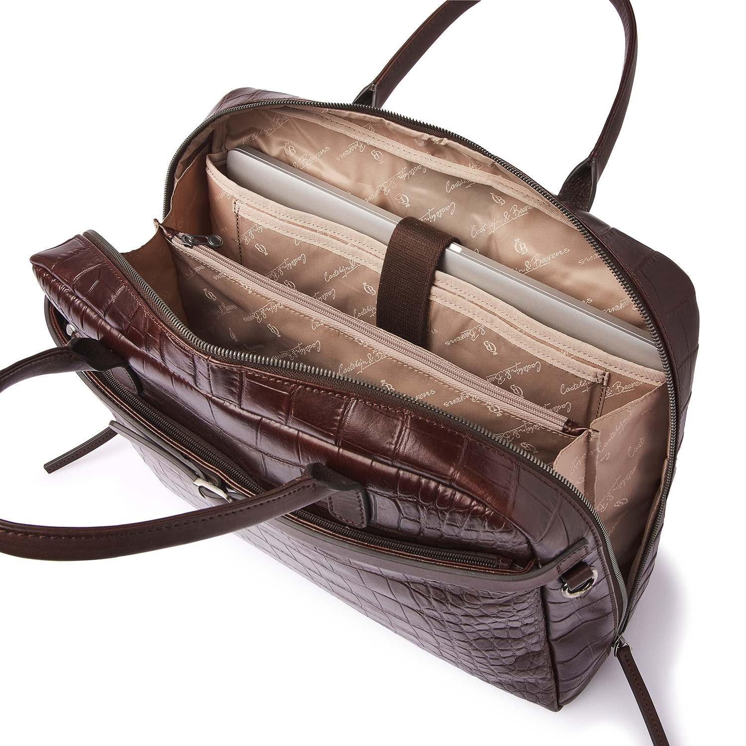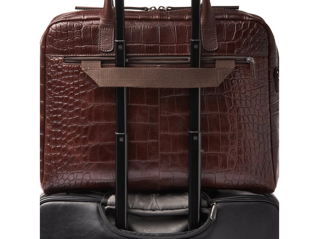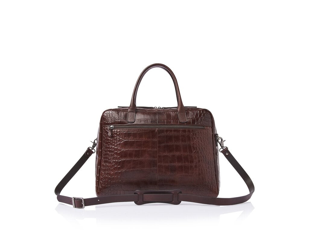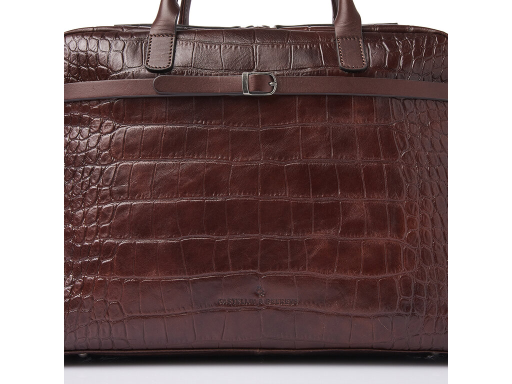 Lisa is a charming appearance, crafted with great attention to detail. For this collection, we developed high-quality bull leather with a classic croco print in collaboration with our Tuscan partner tannery. Not only stylish, but also a sustainable choice. The leather is vegetable tanned according to the guidelines of the Leather Working Group. The handles and shoulder straps are made of sturdy belt leather. This luxurious leather laptop bag features a shock-absorbing 15.6-inch laptop compartment and tablet compartment, an organiser section and a specially protected RFID zip pocket. The bag comes with a detachable leather shoulder strap and a practical trolley sleeve. Easy to carry by hand, over the shoulder or on a trolley handle. The refined C&B embossing completes the luxurious look.