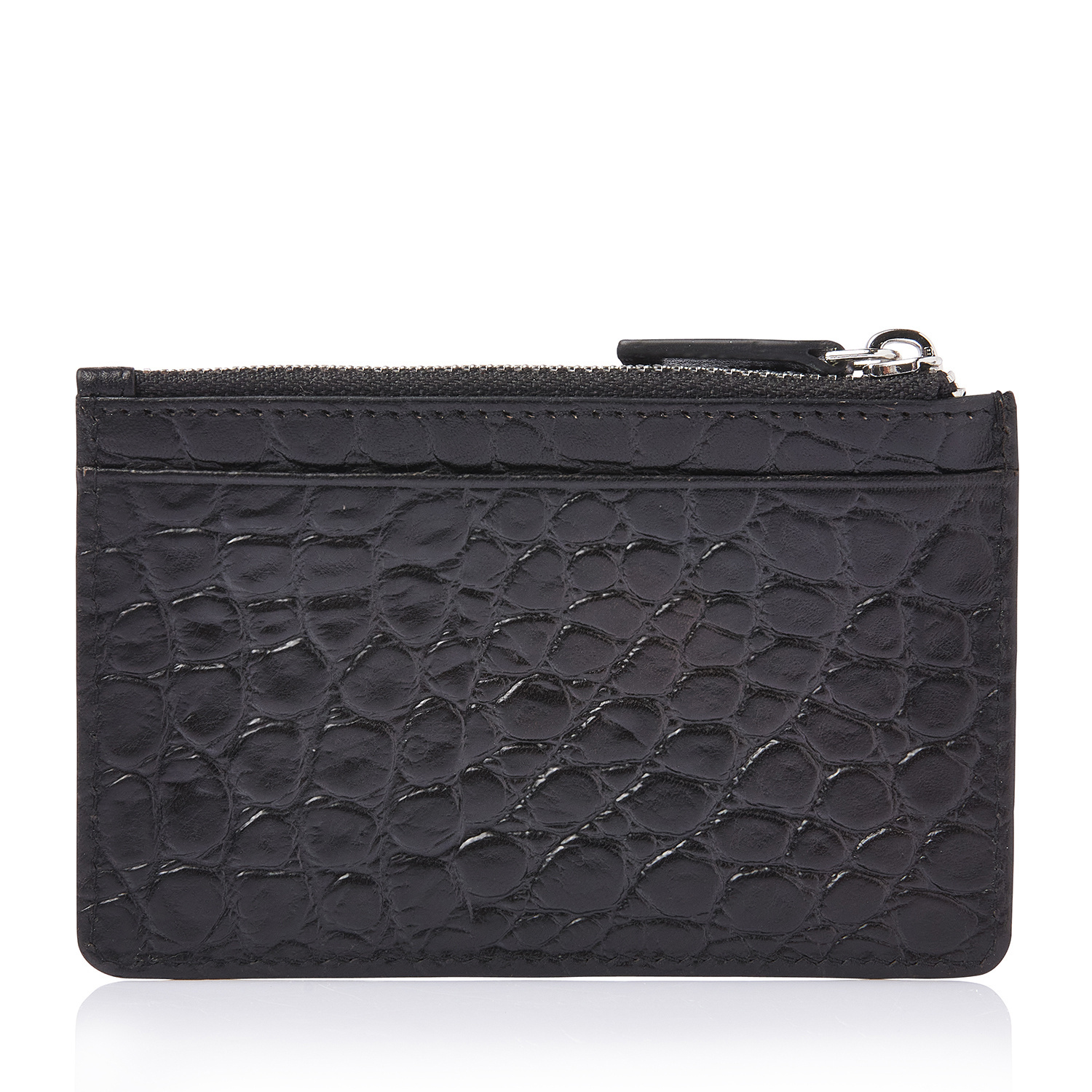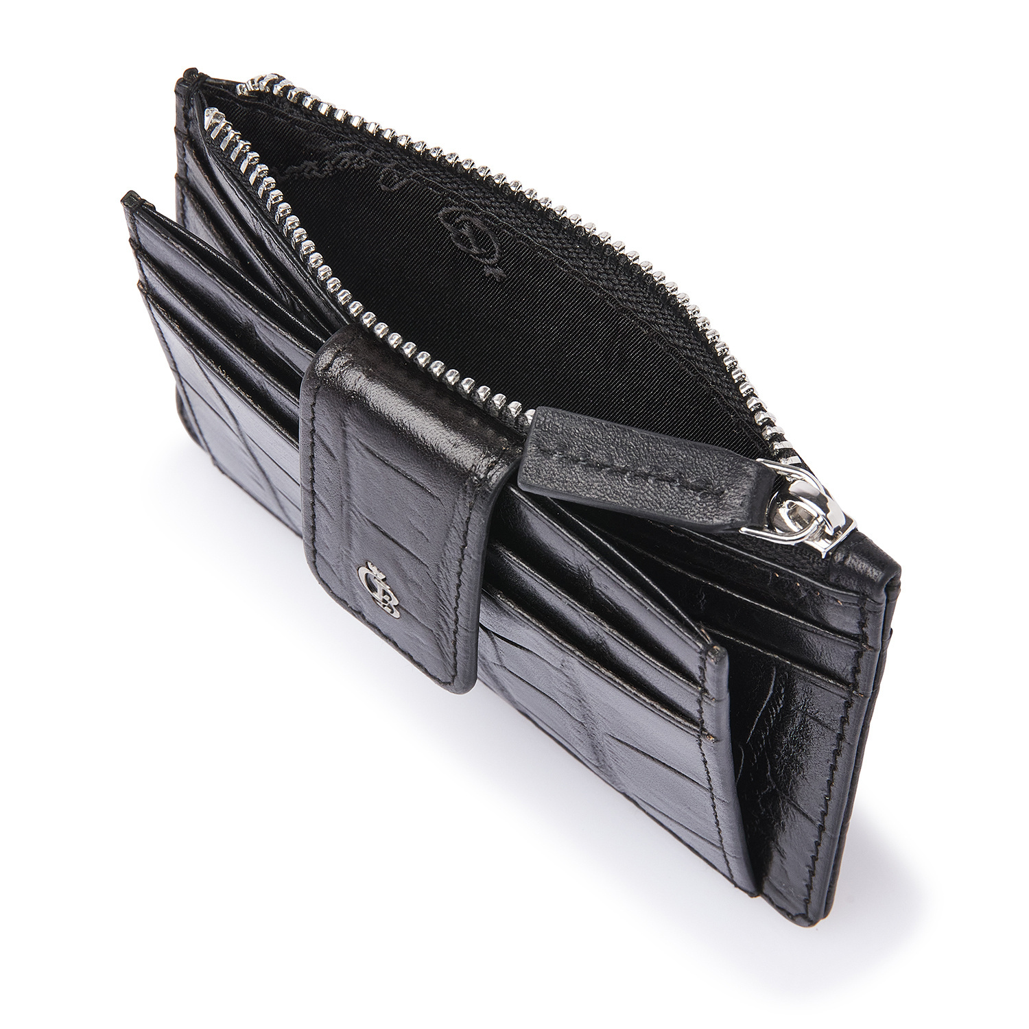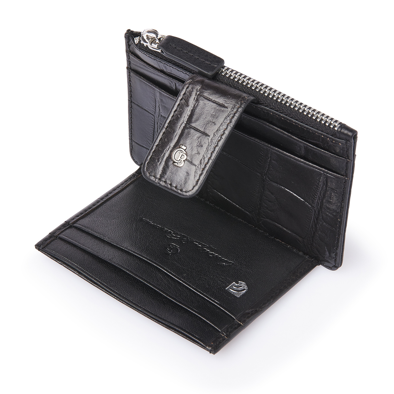 Compact leather RFID mini wallet with a zip pocket, ideal for your most-used cards and some cash. Crafted from premium vegetable-tanned bull leather with a classic croco print, developed in collaboration with our Tuscan partner tannery. Stylish, sustainable and practical. The antique-silver C&B metal logo enhances the luxurious look.