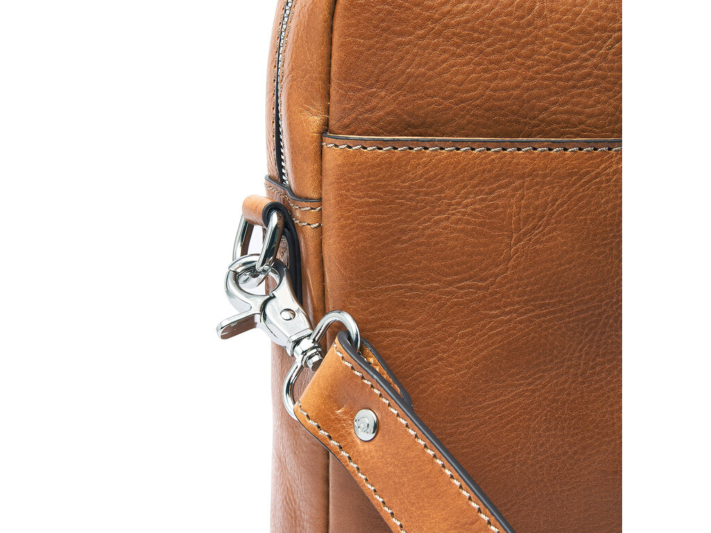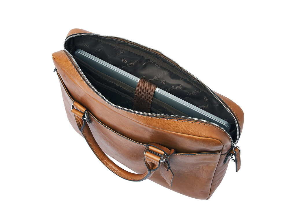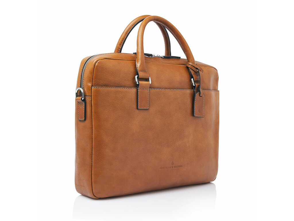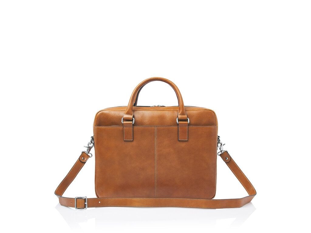 Timeless design, simplicity, and understated elegance — that is what Peter from the Heritage Collection represents. This leather laptop bag features a shock-absorbing 15.6" laptop compartment and a separate tablet pocket. It also offers ample space for an A4 binder, documents, and laptop accessories. An integrated RFID zip pocket provides effective protection against skimming for your bank cards, credit cards, and passport. The bag includes a detachable leather shoulder strap and a convenient trolley strap, discreetly concealed in the back pocket for a sleek appearance. Like all models in the Heritage Collection, Peter is defined by a pure and timeless design. The minimalist silhouette highlights the quality of the vegetable-tanned leather, sustainably produced according to the guidelines of the Leather Working Group. The Italian leather features a natural grain structure, giving each bag its own unique character. Heritage: functional, stylish, and crafted with attention to quality.