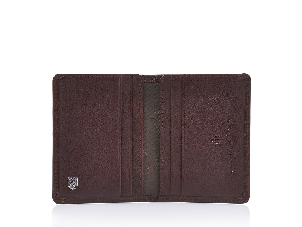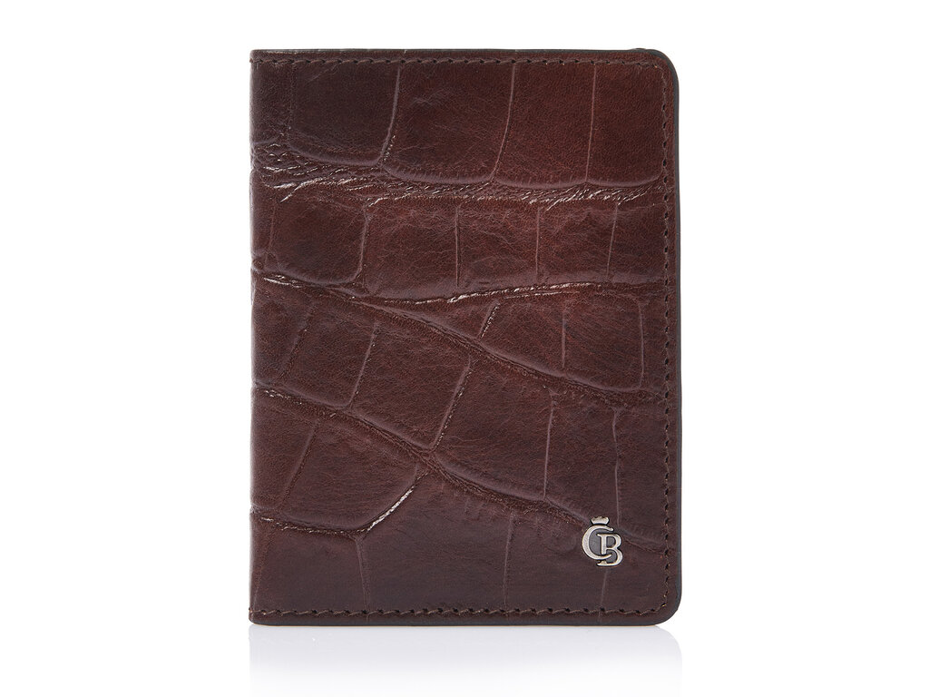 Étui compact pour cartes en cuir pouvant contenir 6 cartes et des billets. Le film RFID intégré empêche la lecture non autorisée des données personnelles via les puces RFID. Fabriqué en cuir de taureau tanné végétalement avec un imprimé croco classique. Finition raffinée avec un logo C&B vieil argent.