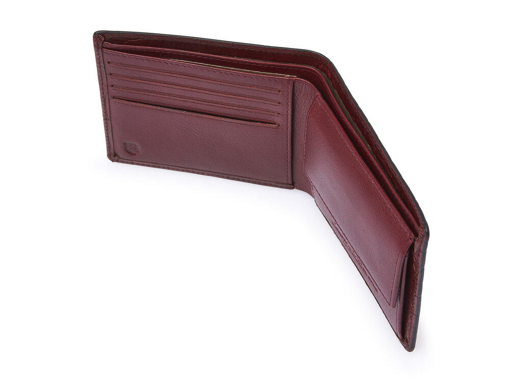 Portefeuille billfold RFID élégant en cuir, au format compact, avec compartiments pour billets et monnaie. Peut contenir 8 cartes de crédit et protège vos données grâce à la technologie RFID. Fabriqué en cuir durablement tanné avec un imprimé croco classique. Le logo C&B vieil argent apporte une touche luxueuse.