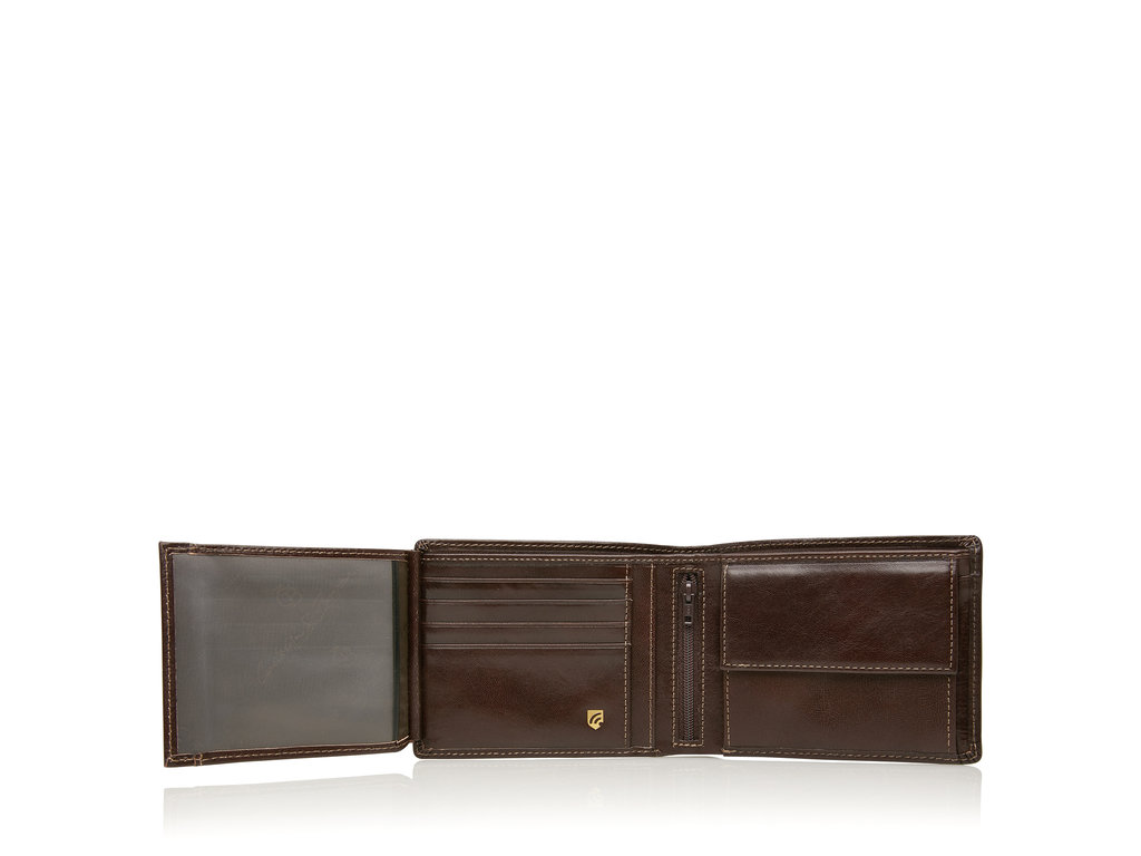 RFID Porte-cartes cuir d'un beau format. Le porte-cartes en cuir pour homme présente des logements pour neuf cartes, un logement repliable pour le permis de conduire, un logement pour la monnaie et un petit logement à fermeture éclair. La collection Gaucho possède une feuille high-tech qui bloque complètement la lecture de vos données personnelles qui se fait par l’intermédiaire de la puce RFID présente dans vos cartes. Ce porte-cartes en cuir de luxe de la gamme Gaucho de Castelijn & Beerens a été confectionné en cuir de taureau traité à l'aide d'un vernis transparent et arbore le superbe logo C&B dans un ovale en cuir. Ce porte-cartes est disponible dans les couleurs noire et moka.