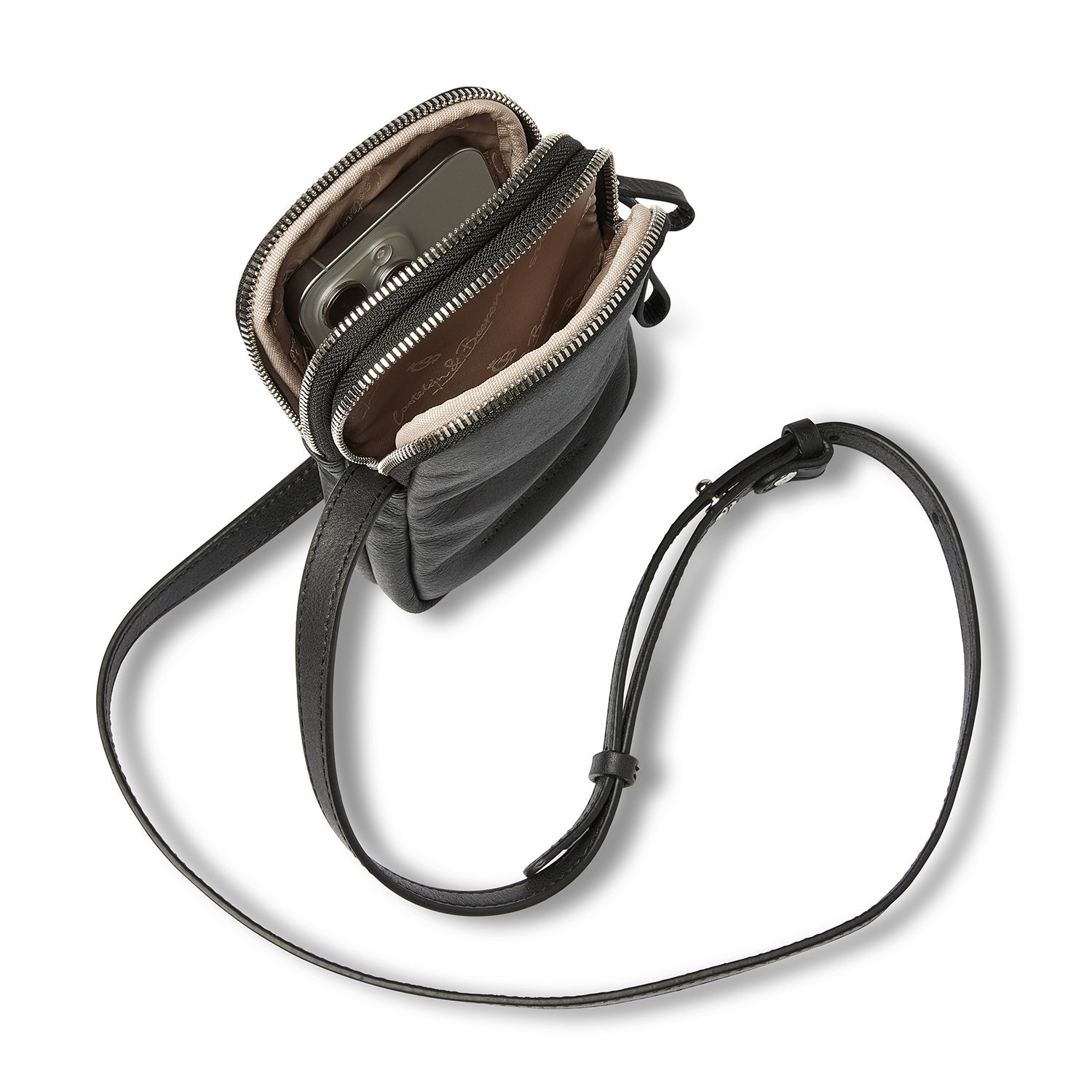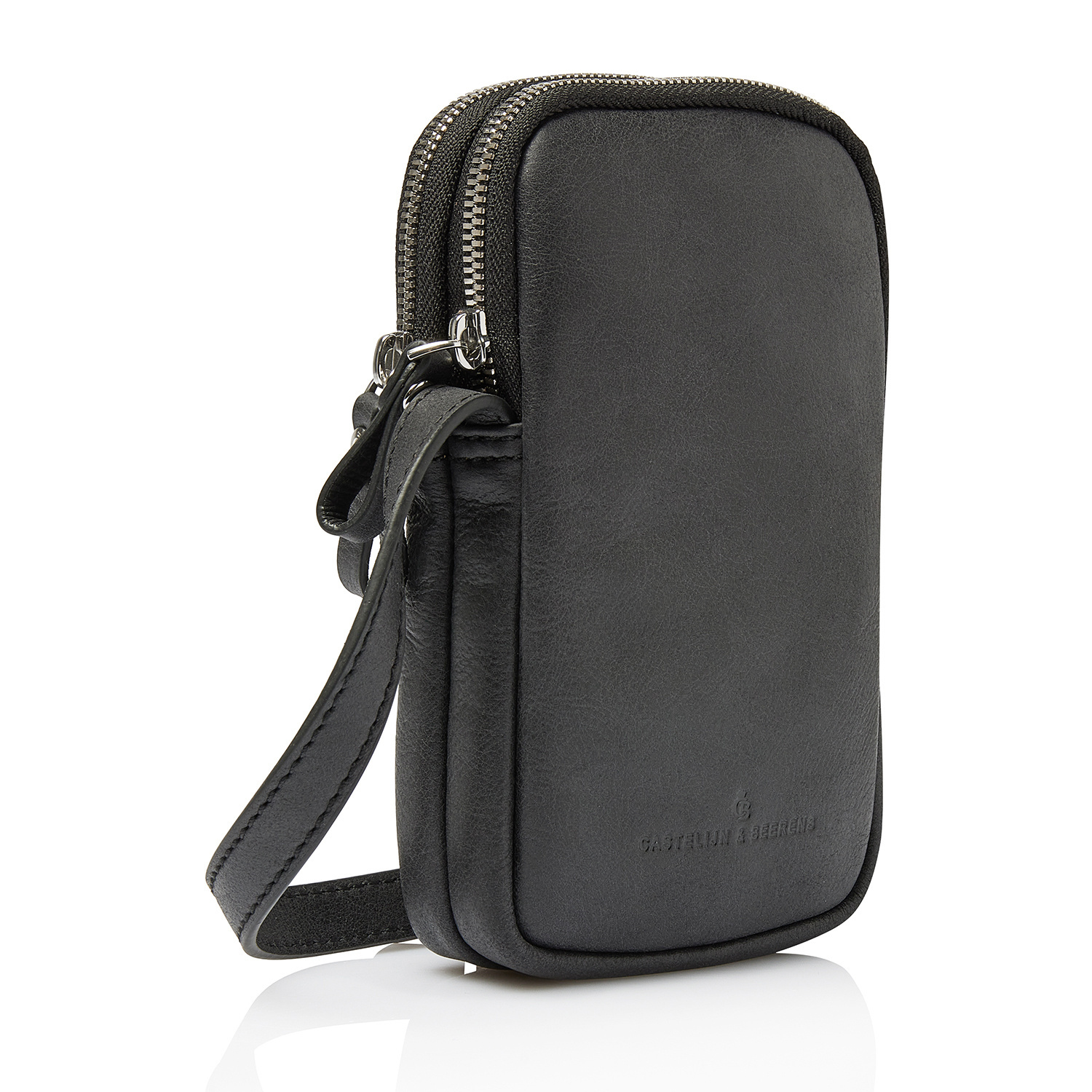 Élégant, fonctionnel et durable. Ce sac téléphone en bandoulière a tout pour plaire. Les 2 compartiments zippés séparés offrent de la place pour un smartphone et, par exemple, un petit portefeuille ou des lunettes. Le sac dispose également de 3 emplacements pour cartes de crédit et d'une bandoulière en cuir réglable. Pour cette collection, nous avons développé, en collaboration avec notre tannerie partenaire italienne, un cuir souple de haute qualité. Non seulement intemporel, mais aussi un choix durable. Le cuir est en effet tanné végétalement selon les directives du Leather Working Group.