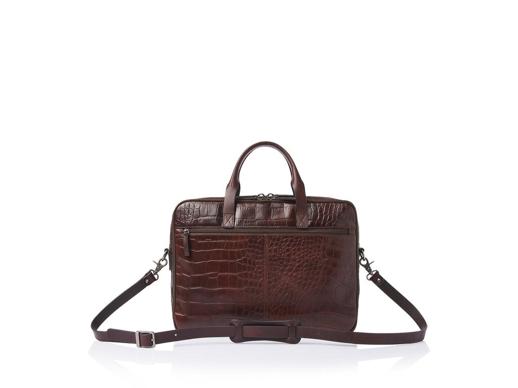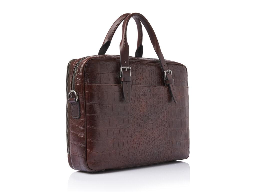 Voici Jules. Confectionné en cuir tanné végétal avec une grande attention portée aux détails. Pour cette collection, nous avons développé, en collaboration avec notre tannerie partenaire en Toscane, un cuir de taureau de haute qualité avec un imprimé croco classique. Non seulement élégant, mais aussi un choix durable. Le cuir est tanné végétalement selon les directives du Leather Working Group. Les poignées et les bandoulières sont fabriquées en cuir de bride robuste. Ce sac pour ordinateur portable en cuir luxueux est doté de deux compartiments principaux zippés, d’un compartiment pour ordinateur portable 15,6 pouces avec protection contre les chocs et d’un compartiment pour tablette, d’un espace organiseur et d’une poche zippée RFID spécialement protégée. Le sac est équipé d’une bandoulière en cuir amovible et d’une sangle trolley pratique. Peut être porté à la main, à l’épaule ou fixé à une poignée de trolley. Le marquage C&B raffiné complète son allure luxueuse.