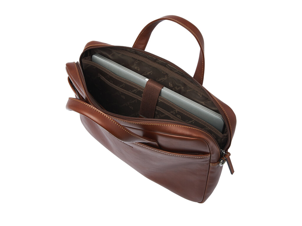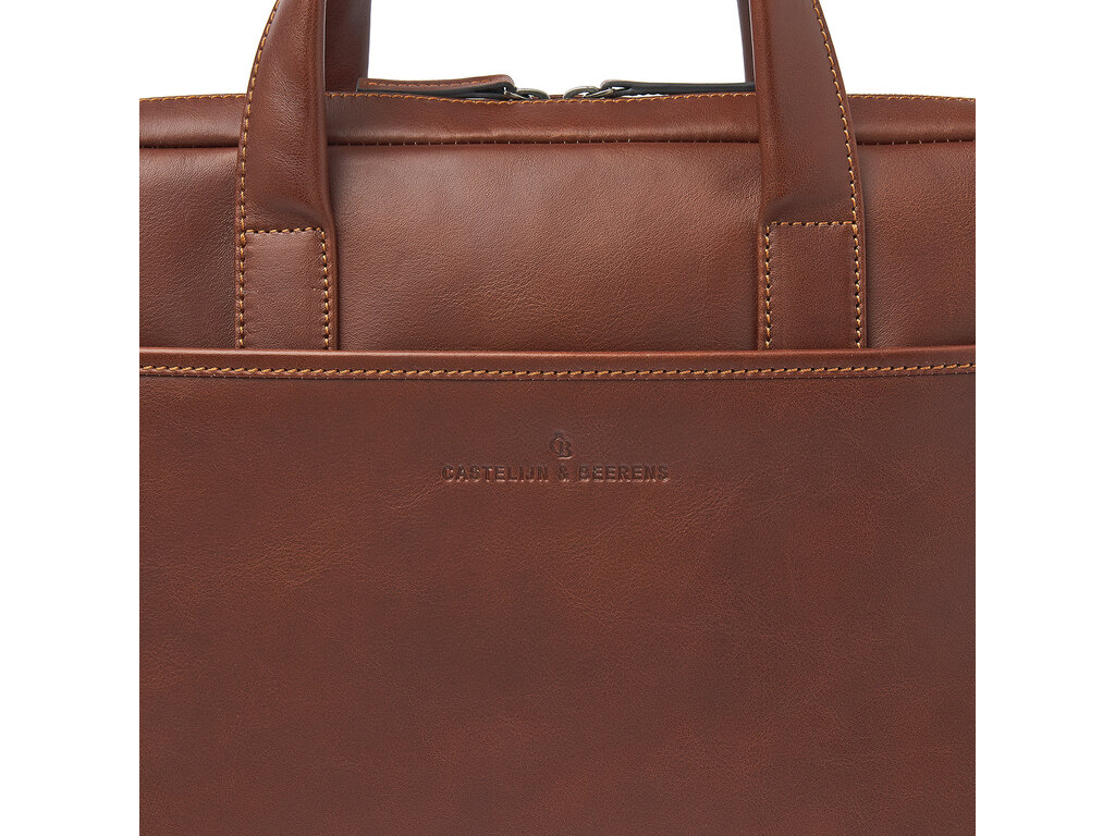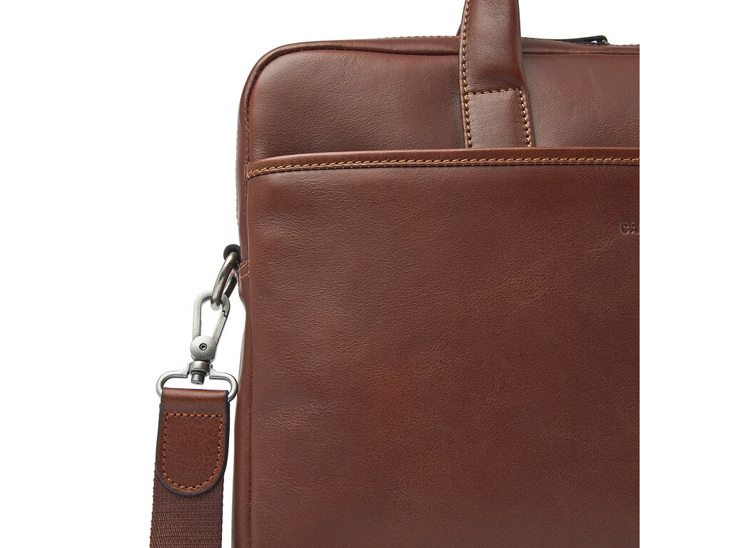 Business in style. Cette sacoche pour ordinateur portable est munie d’un compartiment pour ordinateur et tablette 15,6" absorbant les chocs, d’un compartiment compact pour les dossiers A4, papiers et accessoires d’ordinateur, et fait une première impression inoubliable. Dans le compartiment à fermeture éclair spécial RFID, vos cartes bancaires, cartes de crédit et documents d’identité seront protégés contre le skimming. La sacoche pour ordinateur portable en cuir est pourvue d’une bandoulière amovible en cuir et d’une bande de transport très pratique. Vous pourrez la transporter à la main, sur votre épaule ou sur un chariot à roulettes. Cette sacoche ordinateur en cuir a été confectionné dans un magnifique cuir de bœuf italien. Le logo C&B est intégré subtilement.