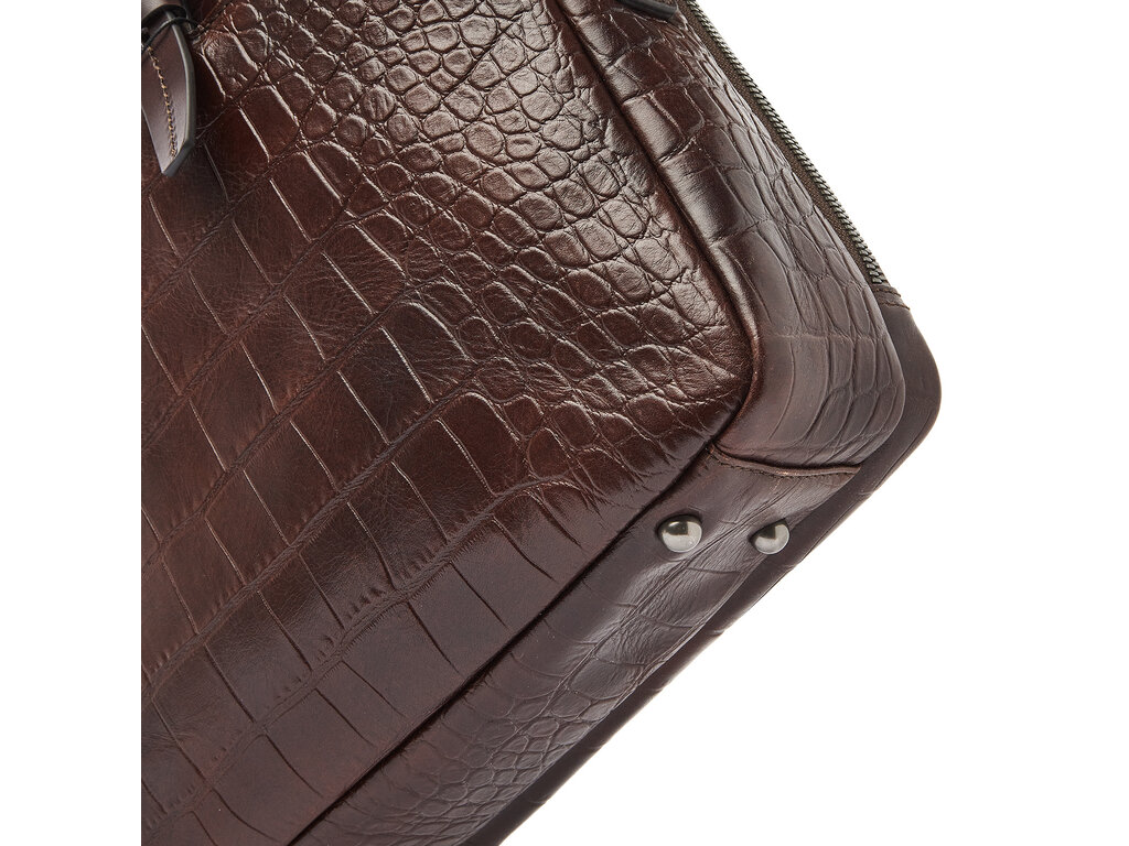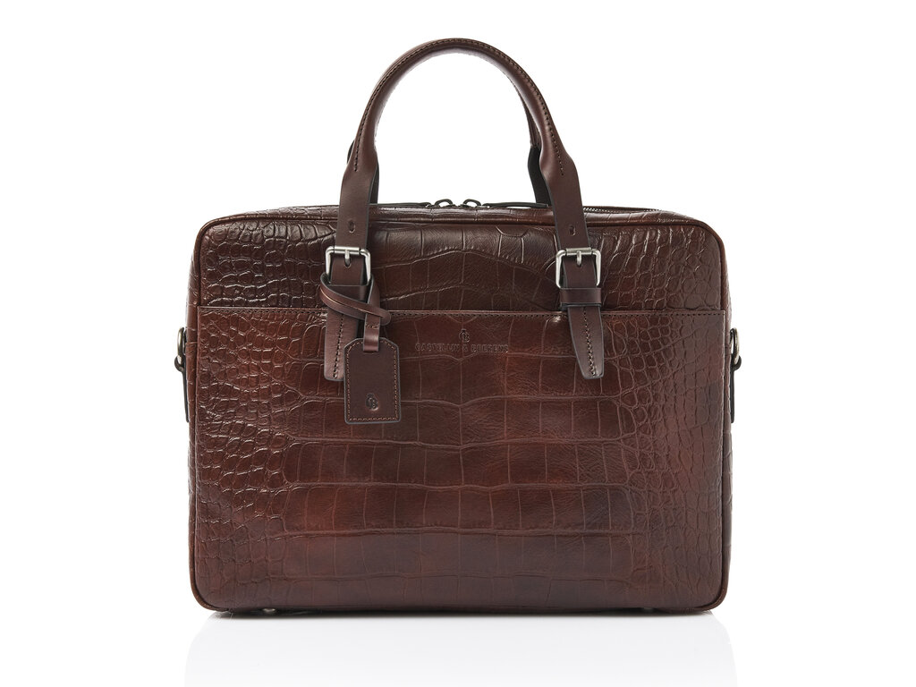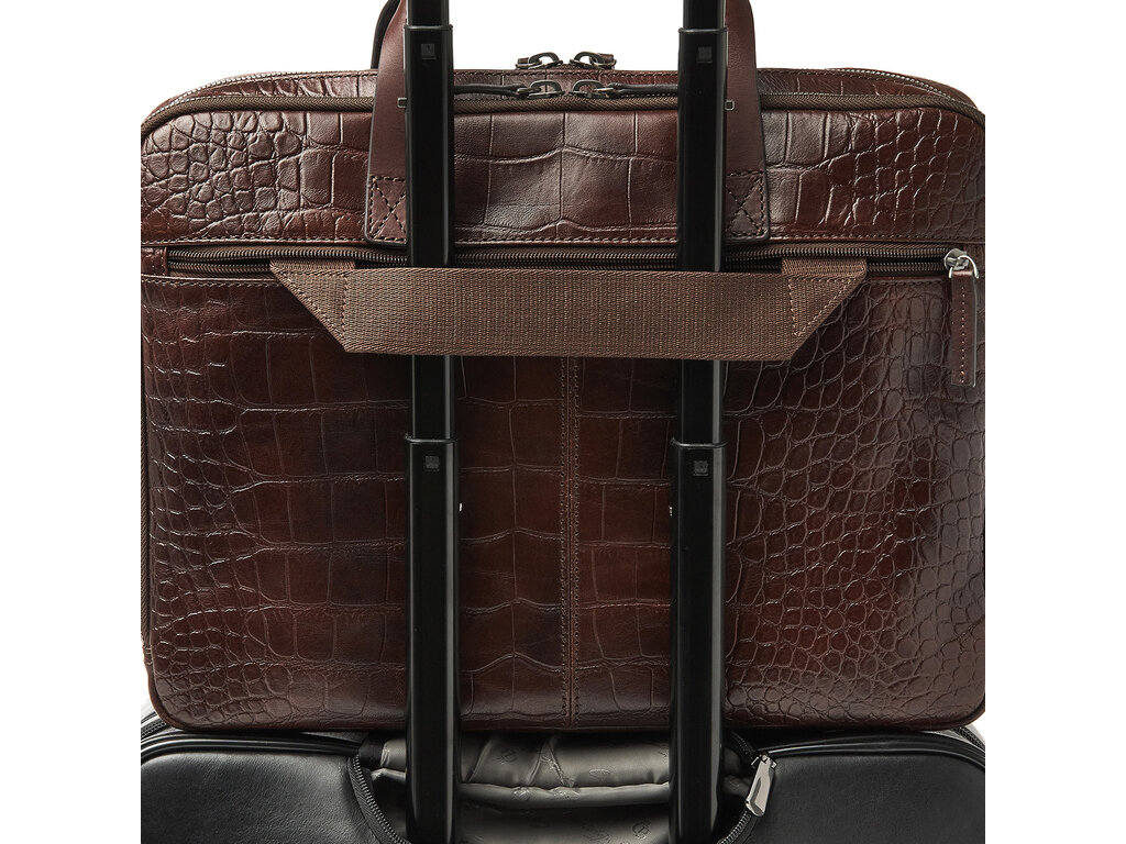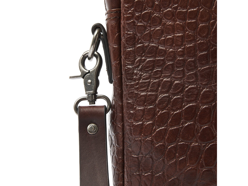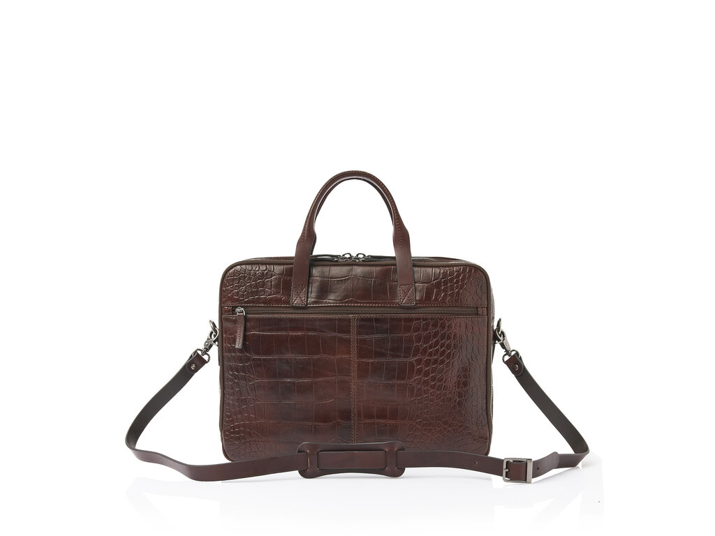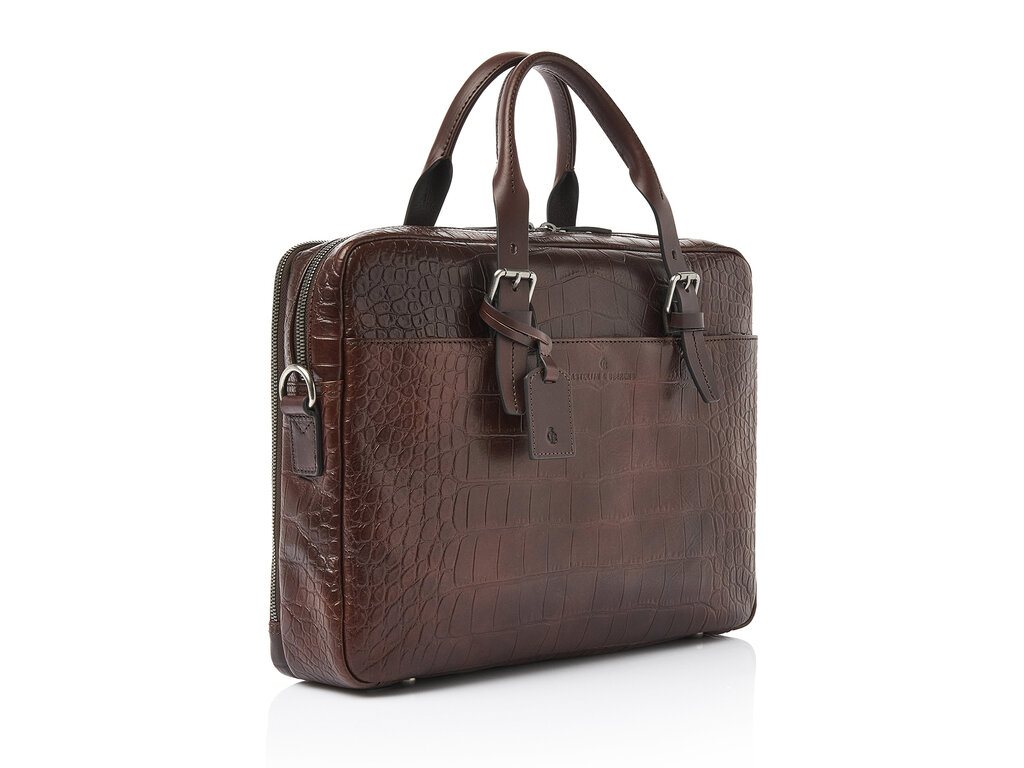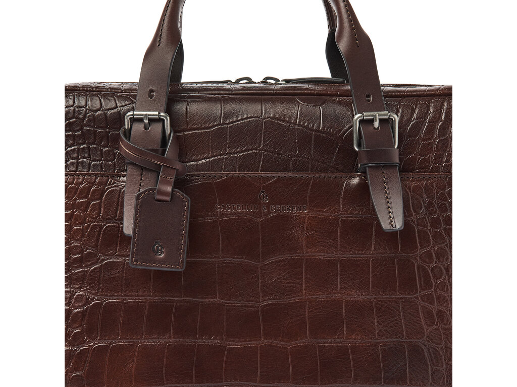 Cette édition limitée allie design intemporel, élégance discrète et raffinement. Le sac ordinateur en cuir dispose de deux compartiments zippés spacieux, d’un compartiment rembourré pour ordinateur 15,6" et d’un emplacement séparé pour tablette. Il offre également de la place pour un dossier A4, des documents et des accessoires, tandis qu’une poche RFID intégrée protège contre le piratage de cartes et passeports. Le sac est équipé d’une bandoulière amovible en cuir et d’une sangle trolley discrètement dissimulée. Fabriqué en édition limitée à partir de cuir de taureau tanné végétalement en Toscane, teint à la main pour mettre en valeur le grain naturel et finition effet croco. Les poignées et la bandoulière sont en cuir de sangle robuste. Intemporel, fonctionnel et exclusif.