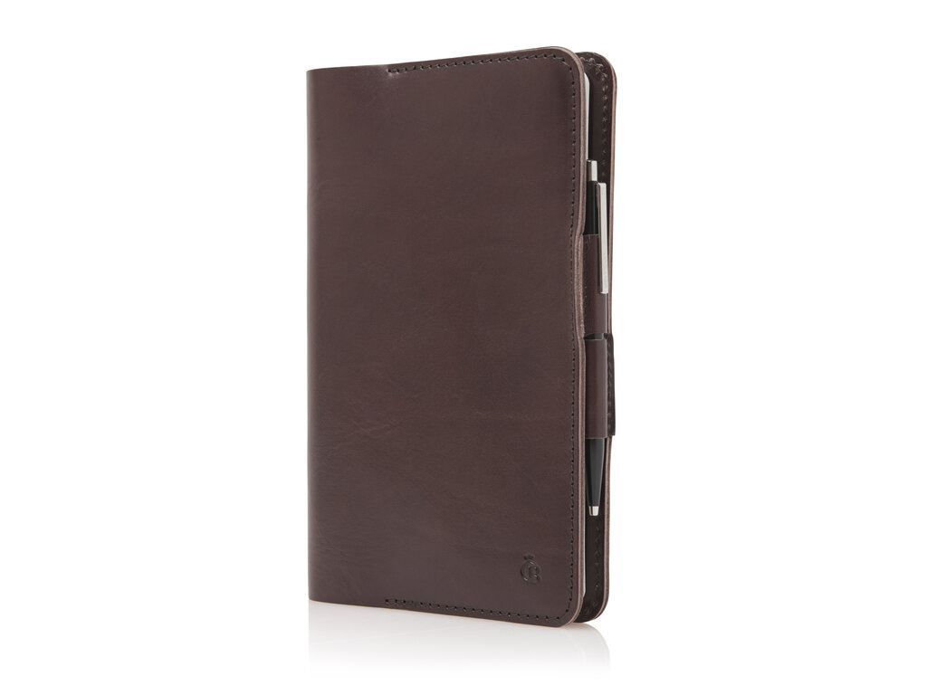 Housse pour notebook en cuir au format A5 avec stylo bille et Moleskine notebook A5. Fabriquée avec amour par des professionnels dans notre atelier de Waalwijk. Un carnet de notes idéal pour y inscrire de brillantes idées, des rapports de voyages, des listes ou toute autre inspiration. Disponible en noir, cognac et moka.