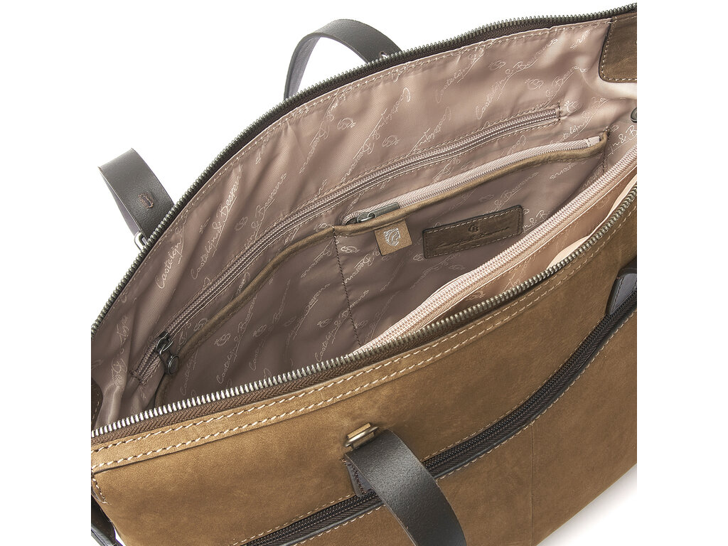 Cette beauté est fabriquée en cuir nubuck Italien de haute qualité avec une finition élégante. Les poignées et la bandoulière sont en cuir végétal. Ce sac en cuir ordinateur est équipé d'une poche moussé ordinateur et tablette de 15,6“, d'une bandoulière en cuir amovible et d'une bande trolley. La poche RFID spéciale protège vos données personnelles contre le skimming. Cette édition limitée est également durable. En effet, le cuir est tanné de manière durable conformément aux directives du Leather Working Group. Élégant, intemporel, exclusif.