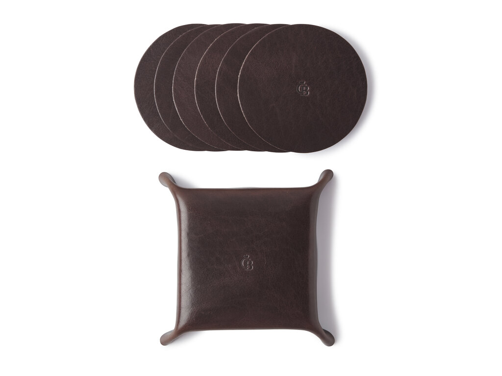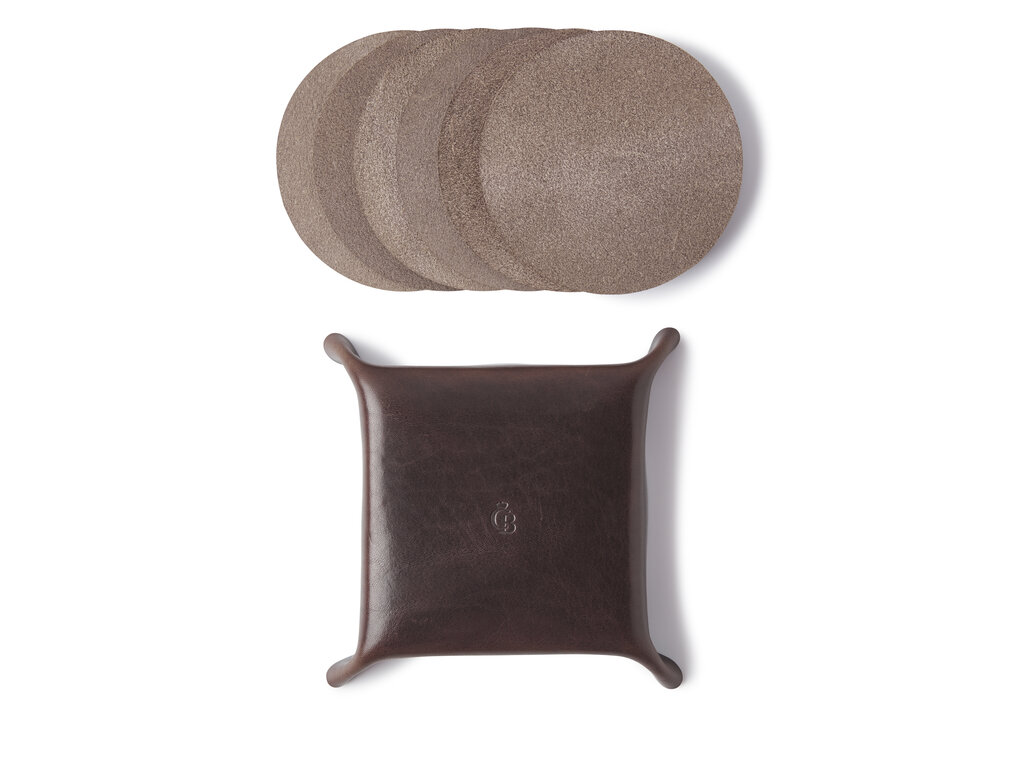 Savourez bien votre boisson avec cette set sous-verre du cuir Italien tanné végétal de qualité supérieure dans vide poche. Fabriqué dans notre atelier a Waalwijk aux Pays-Bas. Vous avez le choix entre noir, moka, cognac et rouge.