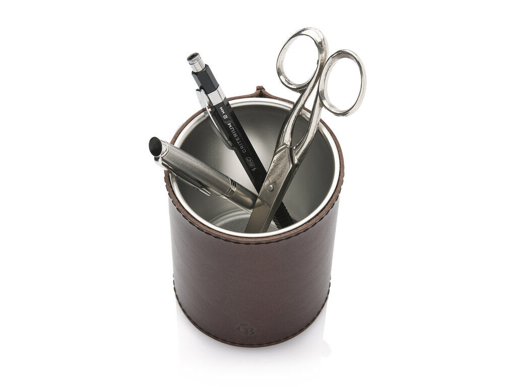 Rangez vos stylos et crayons avec style dans ce solide plumier. Le pot en acier inoxydable est recouvert d'un magnifique cuir de vachette. De plus, c'est un choix durable, car le cuir est tanné de manière durable conformément aux directives du Leather Working Group. Fabriqué dans notre atelier à Waalwijk et disponible en noir, mocca et cognac.