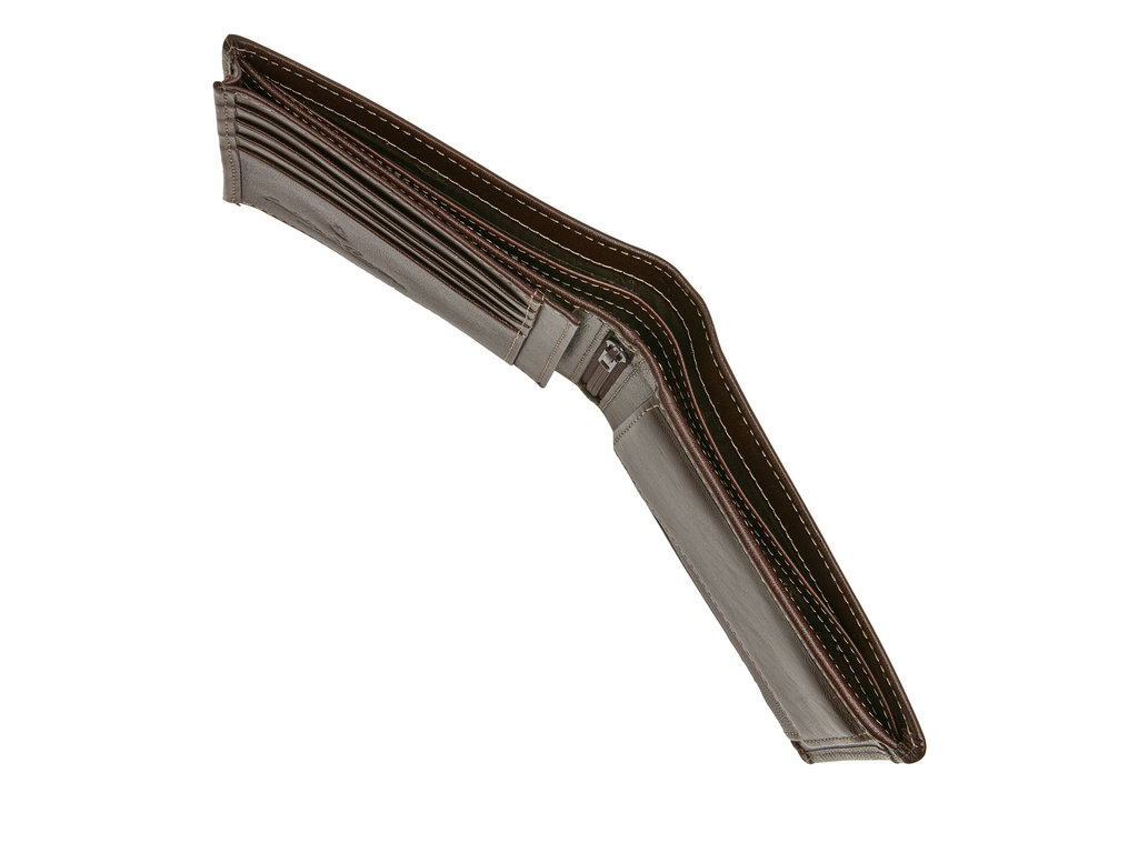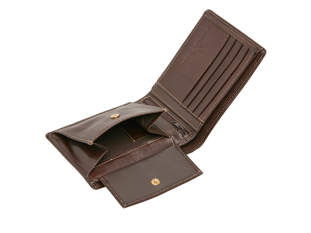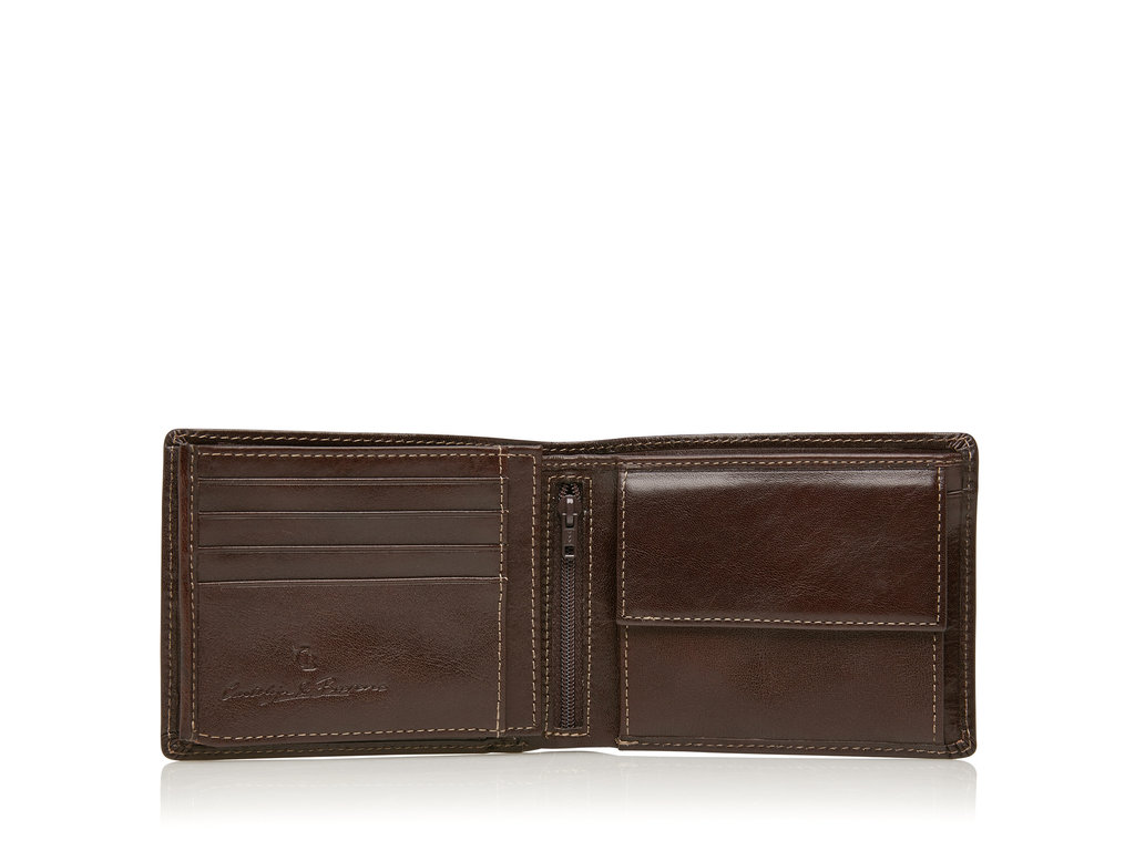 Stijlvolle leren RFID billfold portefeuille in een prettig formaat. De leren herenportemonnee heeft 9 creditcardvakjes, een uitklapbaar vakje voor het rijbewijs, een vakje voor muntgeld en een klein ritsvakje. De Gaucho collectie is uitgerust met een high-tech folie, dat het uitlezen van de persoonlijke gegevens via de RFID-chip op uw pasjes verhindert. Deze luxe billfold portefeuille uit de Gaucho-serie van Castelijn & Beerens is gemaakt van stierenleer behandeld met een transparante verfstof en afgewerkt met het sierlijke C&B-logo in een leren ovaaltje. De leren portefeuille is verkrijgbaar in de kleuren zwart en mocca.