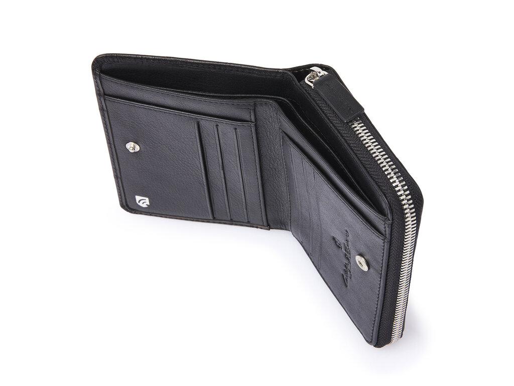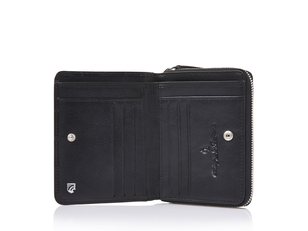 Elegante leren RFID portemonnee met vakken voor papiergeld en een ritsvak voor muntgeld. Voorzien van 8 creditcardvakjes en een geïntegreerde high-tech RFID-folie die uw persoonlijke gegevens volledig beschermt. Gemaakt van hoogwaardig plantaardig gelooid stierenleer met een klassieke croco-print, ontwikkeld in samenwerking met onze Toscaanse partnerlooierij. Afgewerkt met een oudzilveren C&B-logo