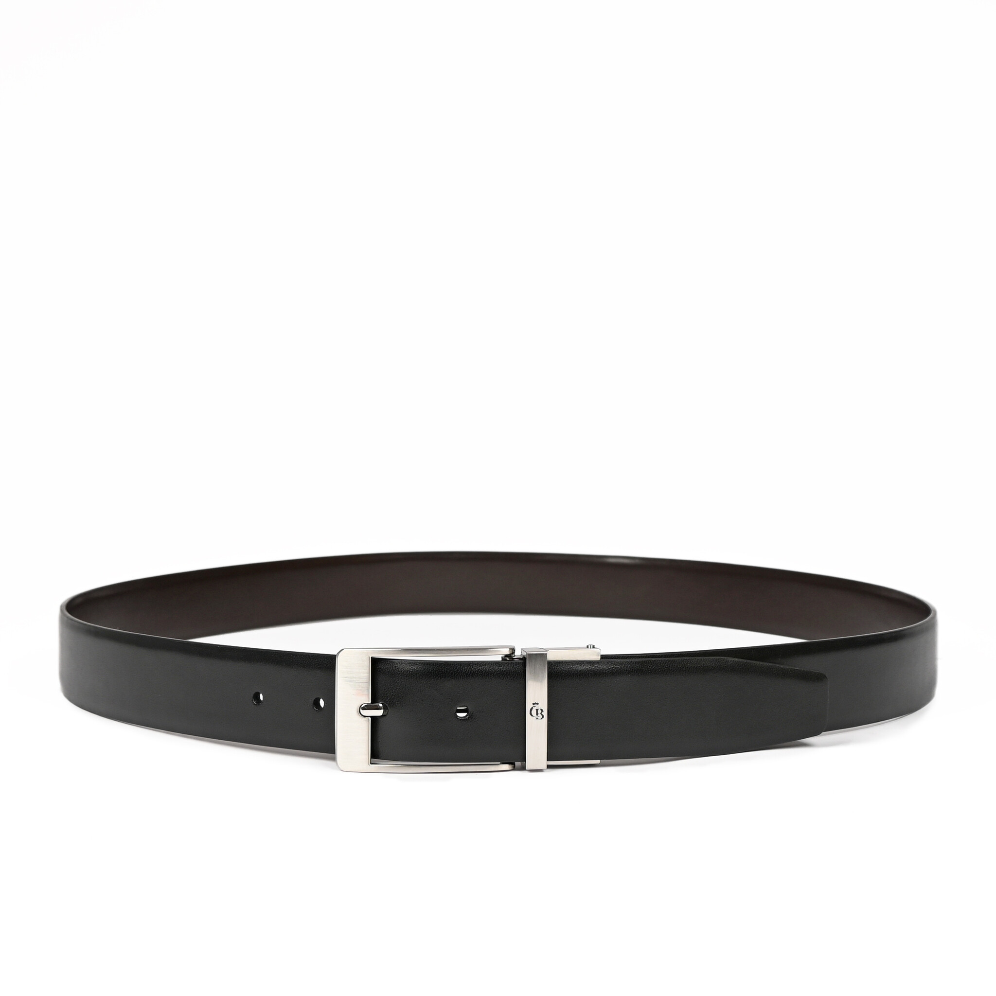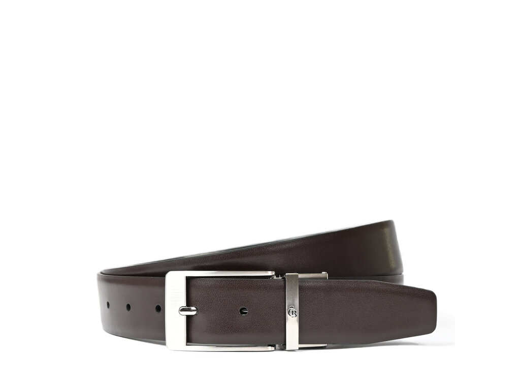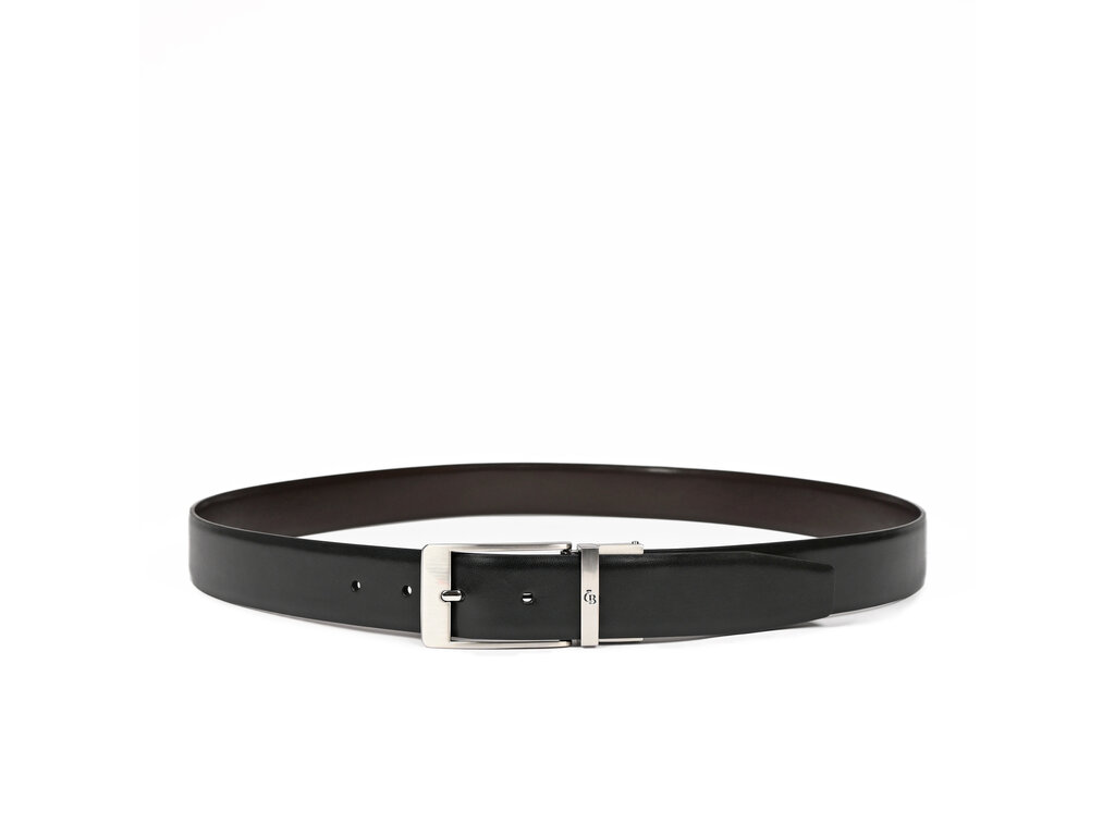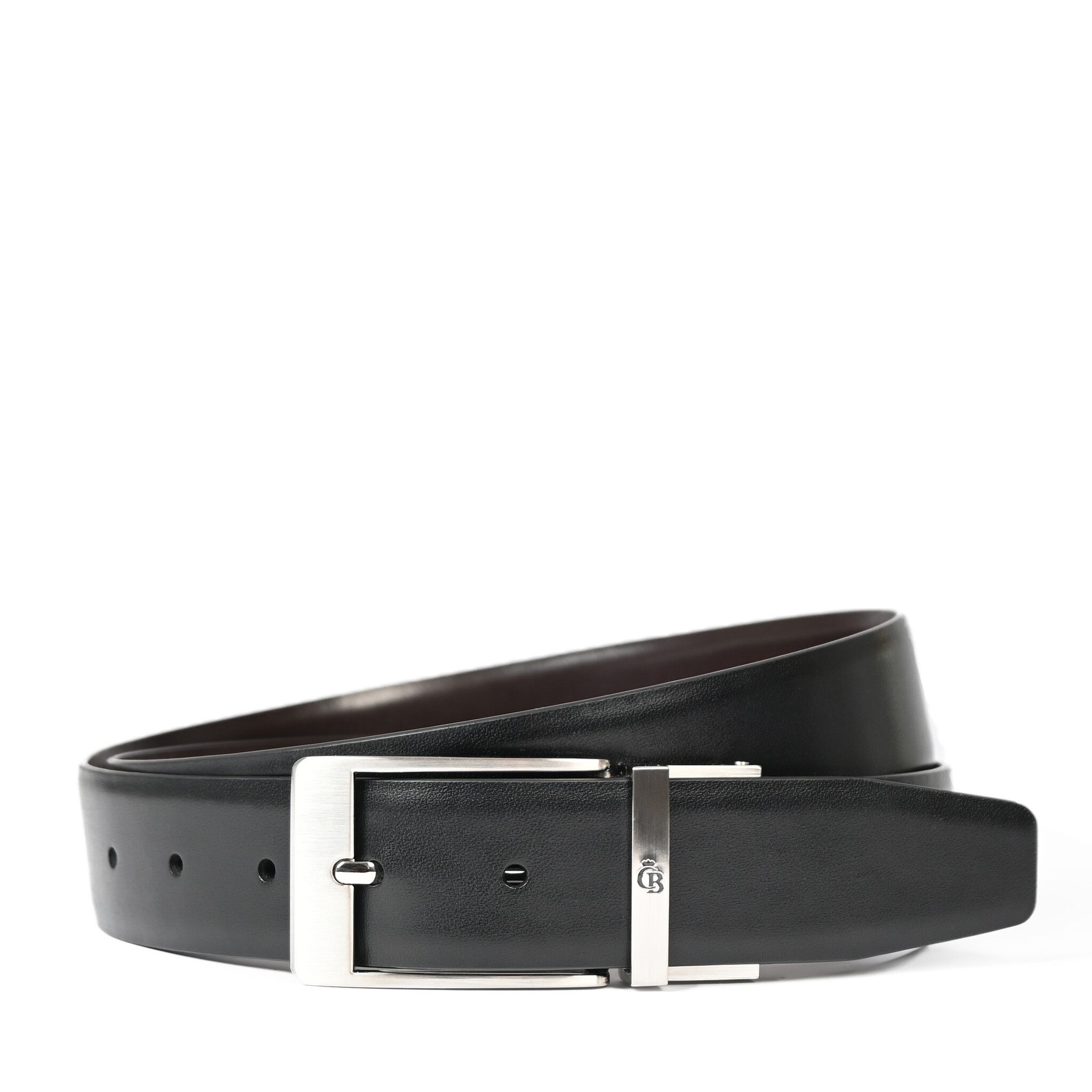 Herenriem van hoogwaardig leer. Enerzijds zwart, anderzijds mocca, 2-zijdig te dragen door middel van een draaigesp. De riem is voorzien van een stijlvolle gesp die elke bij iedere geklede gelegenheid tot zijn recht komt. Dankzij het handige klemsysteem is de riem bovendien eenvoudig op maat te maken, zodat hij altijd perfect past. Een tijdloze accessoire met aandacht voor kwaliteit, stijl en comfort.