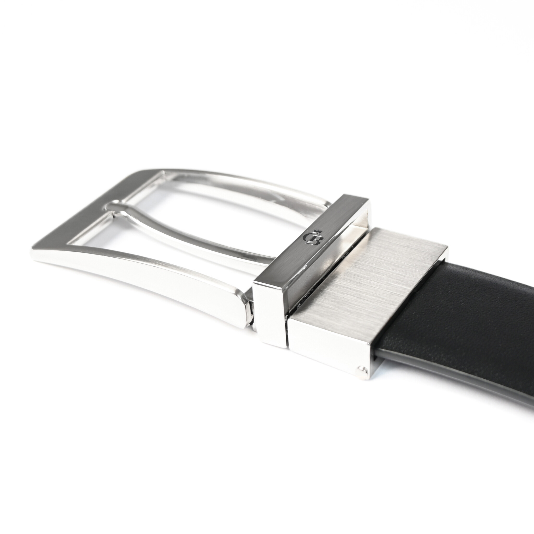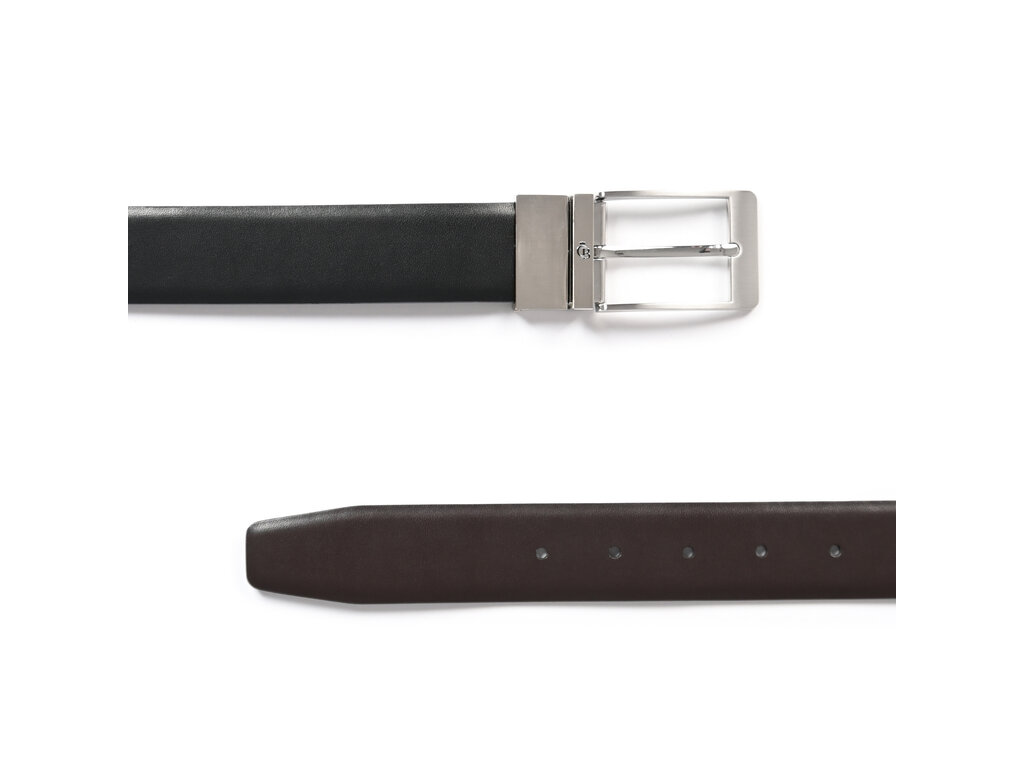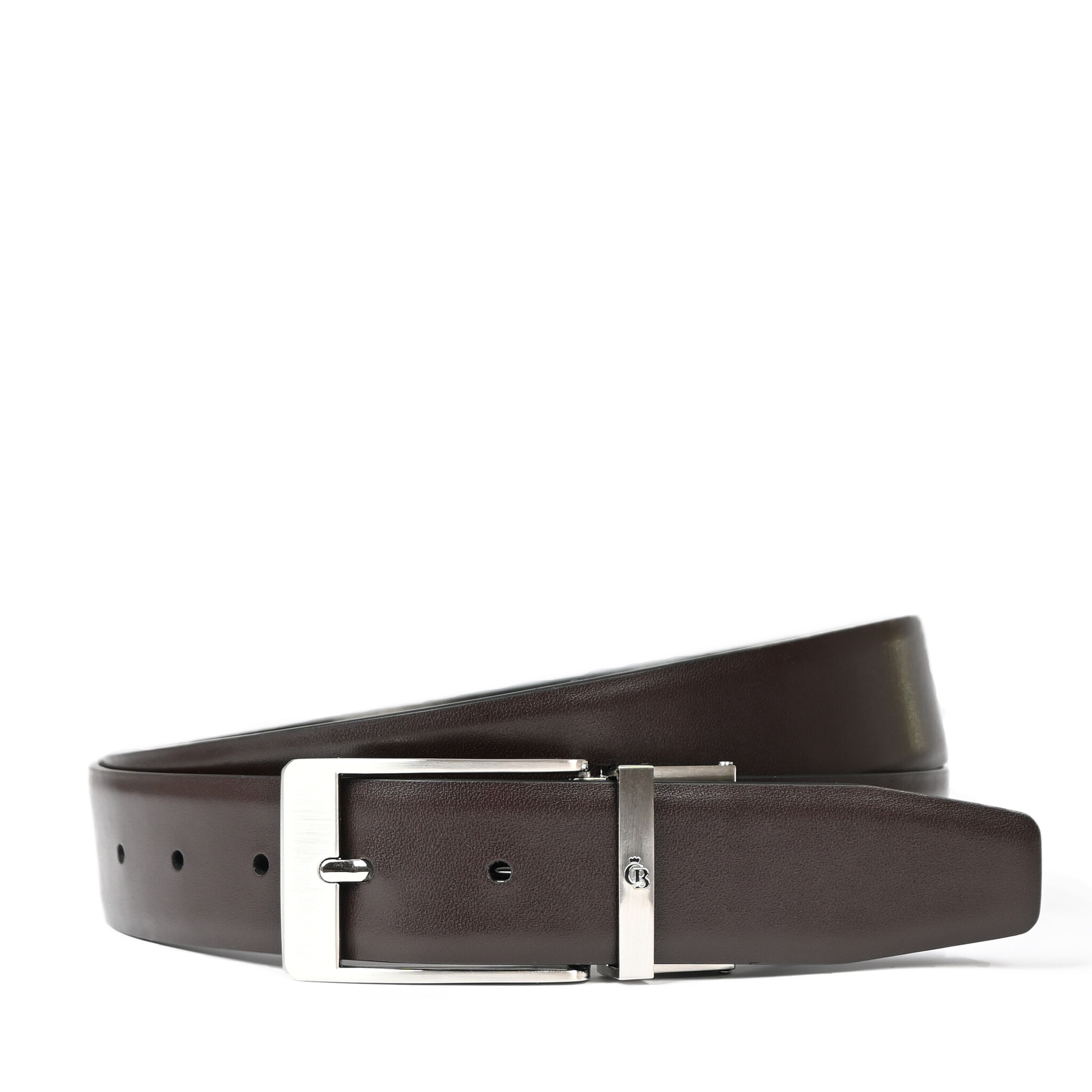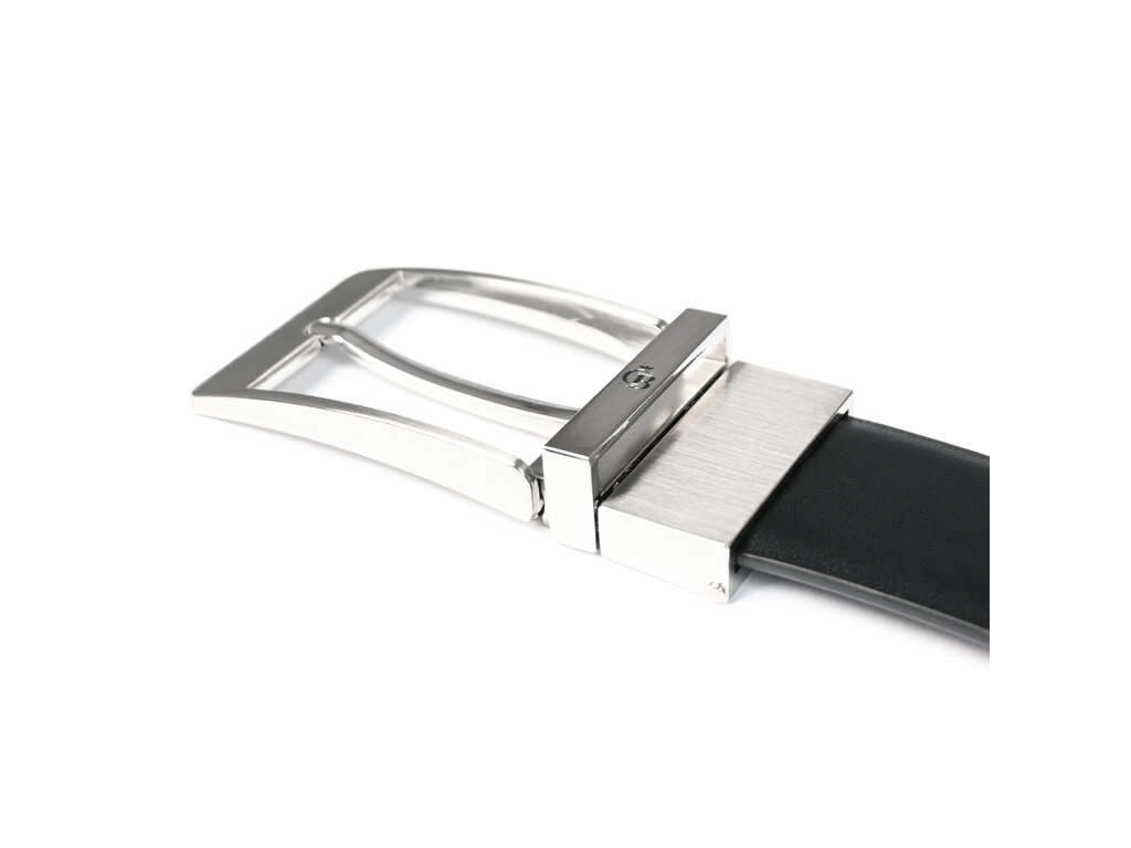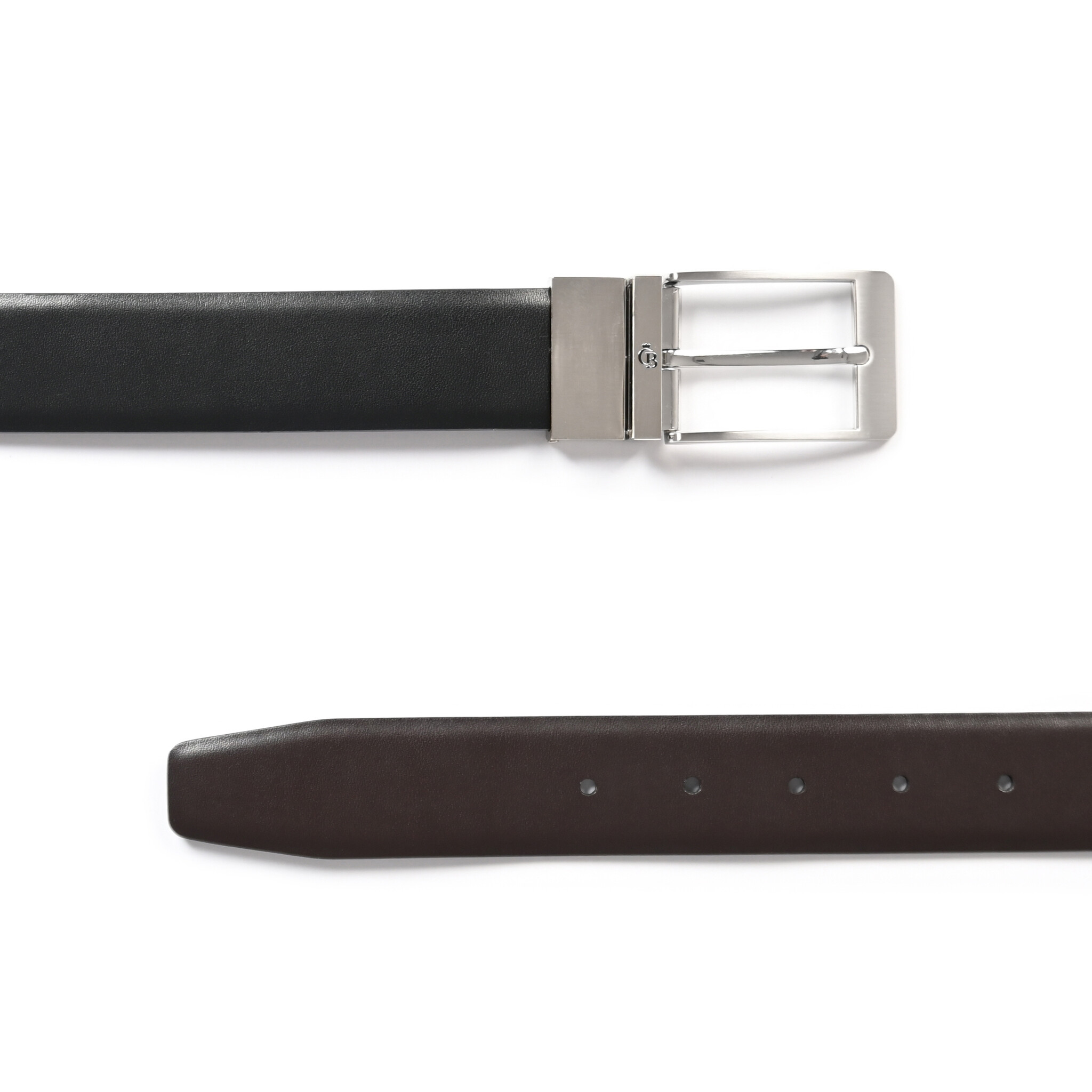 Herenriem van hoogwaardig leer. Enerzijds zwart, anderzijds mocca, 2-zijdig te dragen door middel van een draaigesp. De riem is voorzien van een stijlvolle gesp die elke bij iedere geklede gelegenheid tot zijn recht komt. Dankzij het handige klemsysteem is de riem bovendien eenvoudig op maat te maken, zodat hij altijd perfect past. Een tijdloze accessoire met aandacht voor kwaliteit, stijl en comfort.