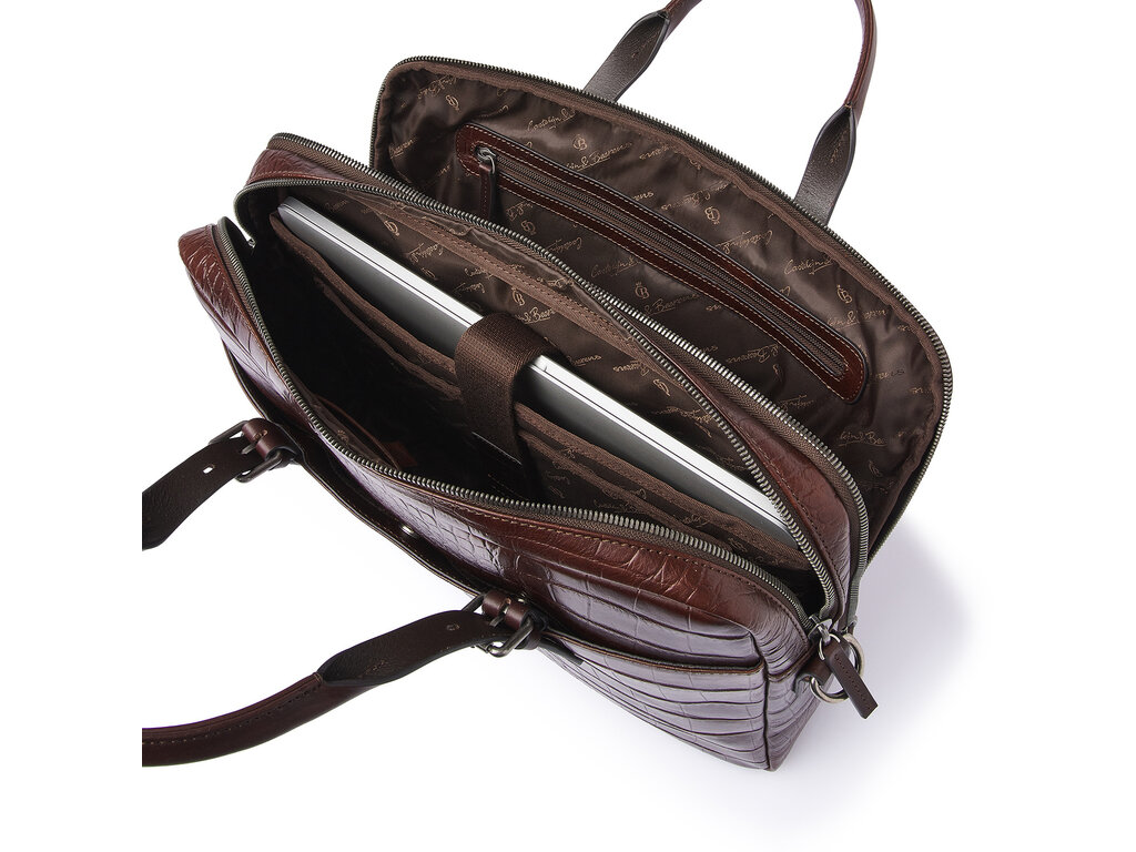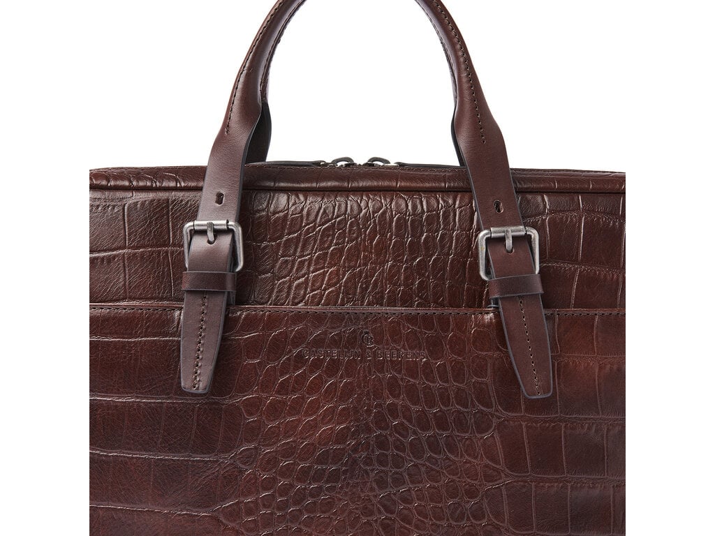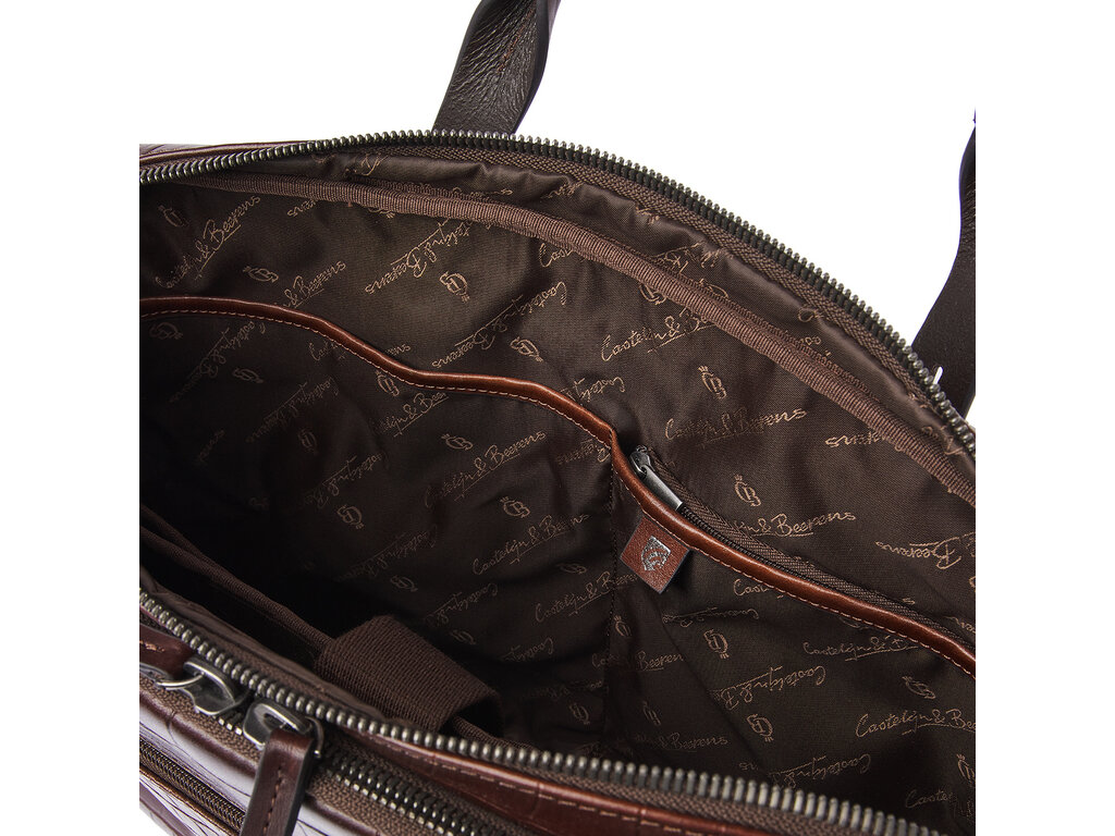 Dit is Jules: een verfijnde laptoptas, vervaardigd van plantaardig gelooid leer met oog voor elk detail. In samenwerking met onze Toscaanse partner-looierij ontwikkelden we voor deze collectie hoogwaardig stierenleer met een klassieke croco-print. Een stijlvolle keuze, maar ook een duurzame: het leer is plantaardig gelooid volgens de richtlijnen van de Leather Working Group. De handvatten en schouderbanden zijn gemaakt van stevig riemenleer. De tas beschikt over twee hoofdvakken met rits, een schokabsorberend laptopvak voor laptops tot 15,6 inch, een apart tabletvak, een organiser-gedeelte en een speciaal RFID-ritsvak ter bescherming tegen skimmen. Dankzij de afneembare leren schouderband en de praktische trolleyband draagt u Jules comfortabel in de hand, over de schouder of op uw trolley. De verfijnde C&B-preeg maakt de luxe uitstraling compleet.