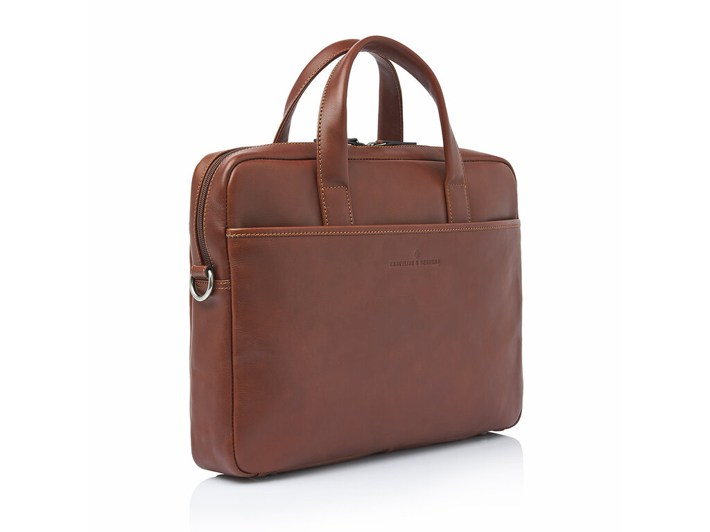 Deze lederen laptoptas is een echte businesspartner. De tas is voorzien van een schokabsorberend 15,6 inch laptop- en tabletvak, diverse handige steek- en ritsvakken en een high-tech RFID-vak. Deze leren laptoptas is gemaakt van prachtig Italiaans met natuurlijke nerf. De Toscaanse looierij, waar we al meer dan 40 jaar mee samenwerken, is gespecialiseerd in traditionele plantaardig looiing. De tas is voorzien van een lederen, afneembare, schouderband en praktische trolleyband. Zowel in de hand, over uw schouder of over de trolleyhandle mee te nemen. Het C&B-logo is subtiel als präg verwerkt.