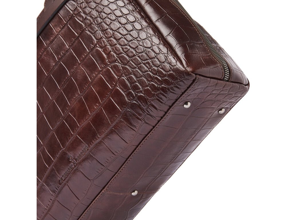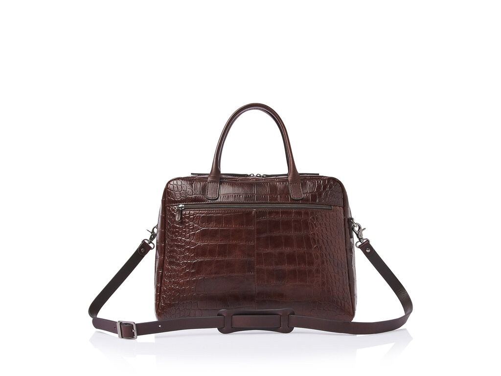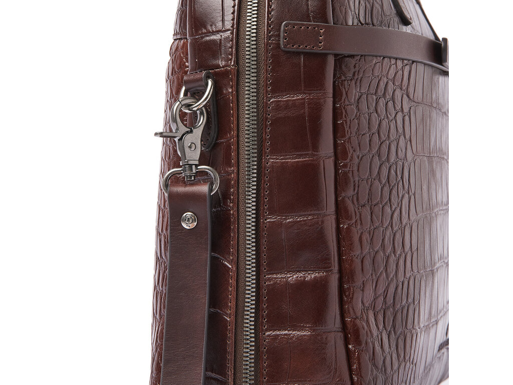 Lisa is een charmante laptoptas, met zorg en aandacht voor detail ontworpen. Voor deze collectie ontwikkelden we in samenwerking met onze Toscaanse partner-looierij hoogwaardig stierenleer met een klassieke croco-print. Het plantaardig gelooide leer voldoet aan de richtlijnen van de Leather Working Group en maakt Lisa tot een stijlvolle én duurzame keuze. De handvatten en schouderband zijn vervaardigd van stevig riemenleer. De tas beschikt over een schokabsorberend laptopvak voor laptops tot 15,6 inch, een tabletvak, een overzichtelijk organiser-gedeelte en een speciaal RFID-ritsvak ter bescherming tegen skimmen. Dankzij de afneembare leren schouderband en de praktische trolleyband draagt u Lisa comfortabel in de hand, over de schouder of op uw trolley. De verfijnde C&B-preeg maakt de luxe uitstraling helemaal af.