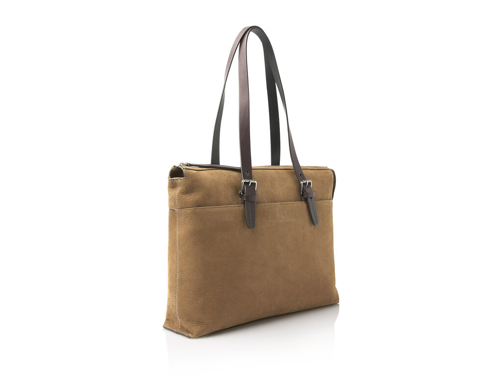 Deze schoudertas is gemaakt van hoogwaardig Italiaans nubuck leer en voorzien van een schokabsorberend 15,6 inch laptop- en tabletvak. Voor de handvatten en schouderband is gebruik gemaakt van stevig plantaardig gelooid tuigleer. In het speciale RFID ritsvak worden uw persoonlijke gegevens beschermd tegen skimmen. De limited edition is duurzaam bovendien. Het leer is namelijk plantaardig gelooid volgens de richtlijnen van de Leather Working Group. De combinatie van het gevleugde nubuck in taupe met het tijdloze tuigleer maakt deze laptoptas een elegante klassieker.